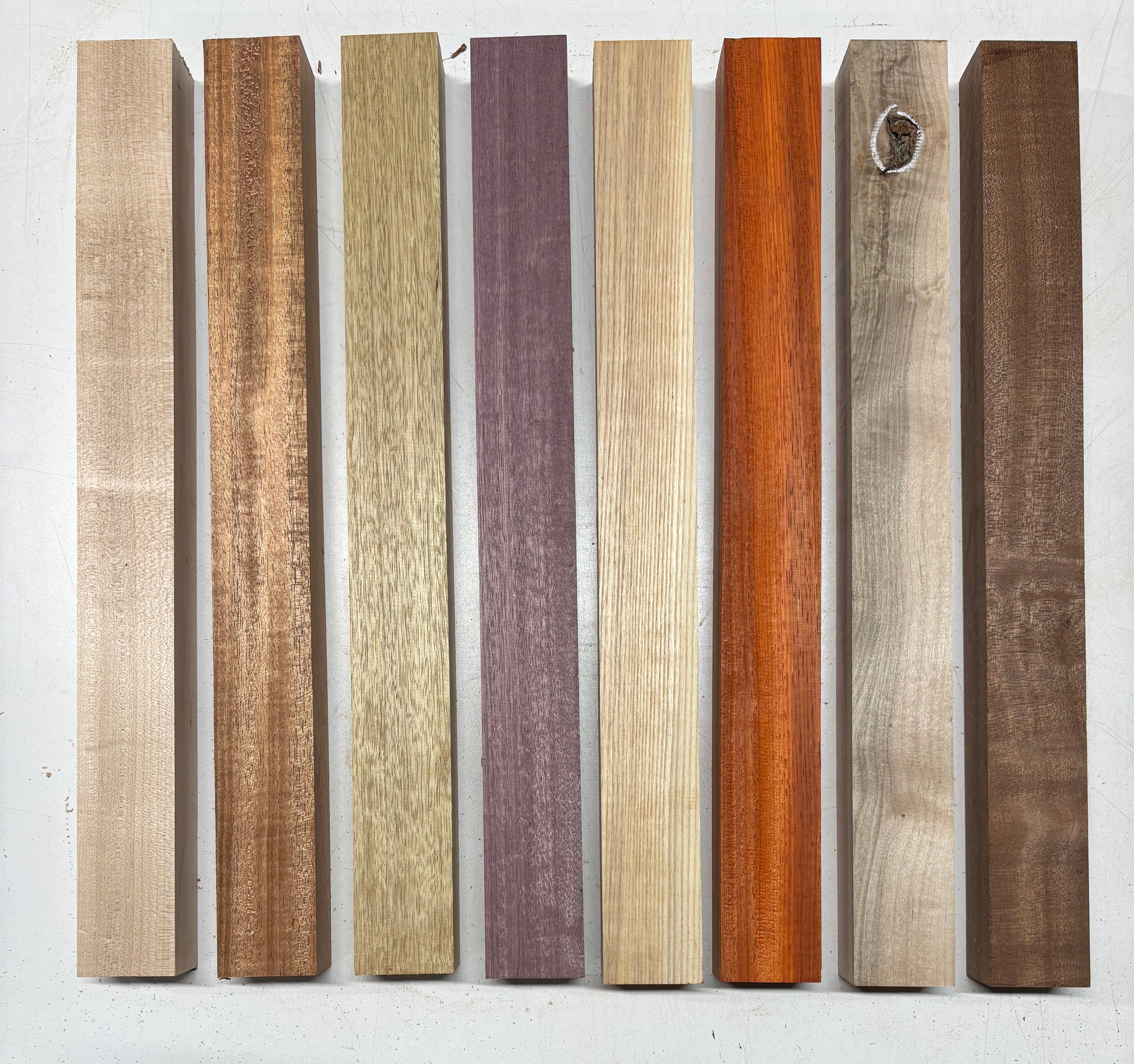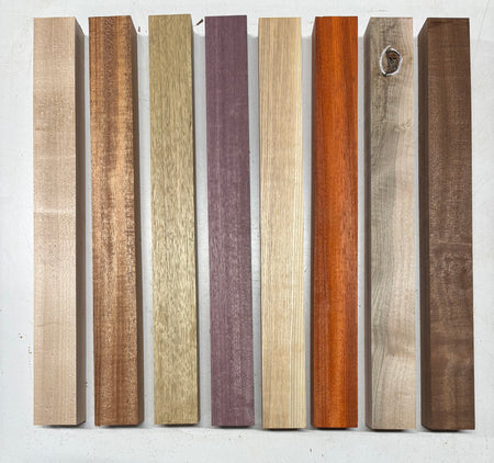 8 Pieces, Unglued 8 Species White Limba + Purpleheart + Hard maple + Padauk + Sapele + Ambrosia Maple + White Ash + African Mahogany Turning Blank 18"x1-7/8"x1-1/4"#6633