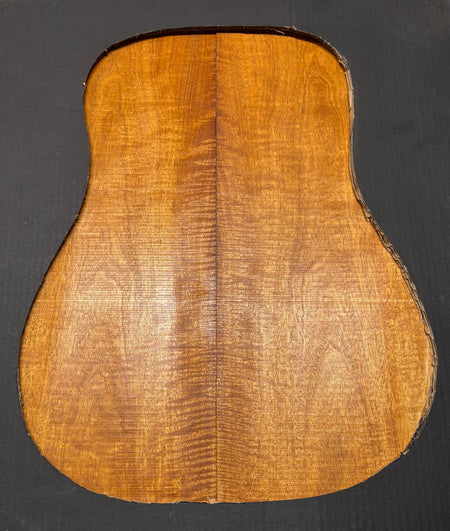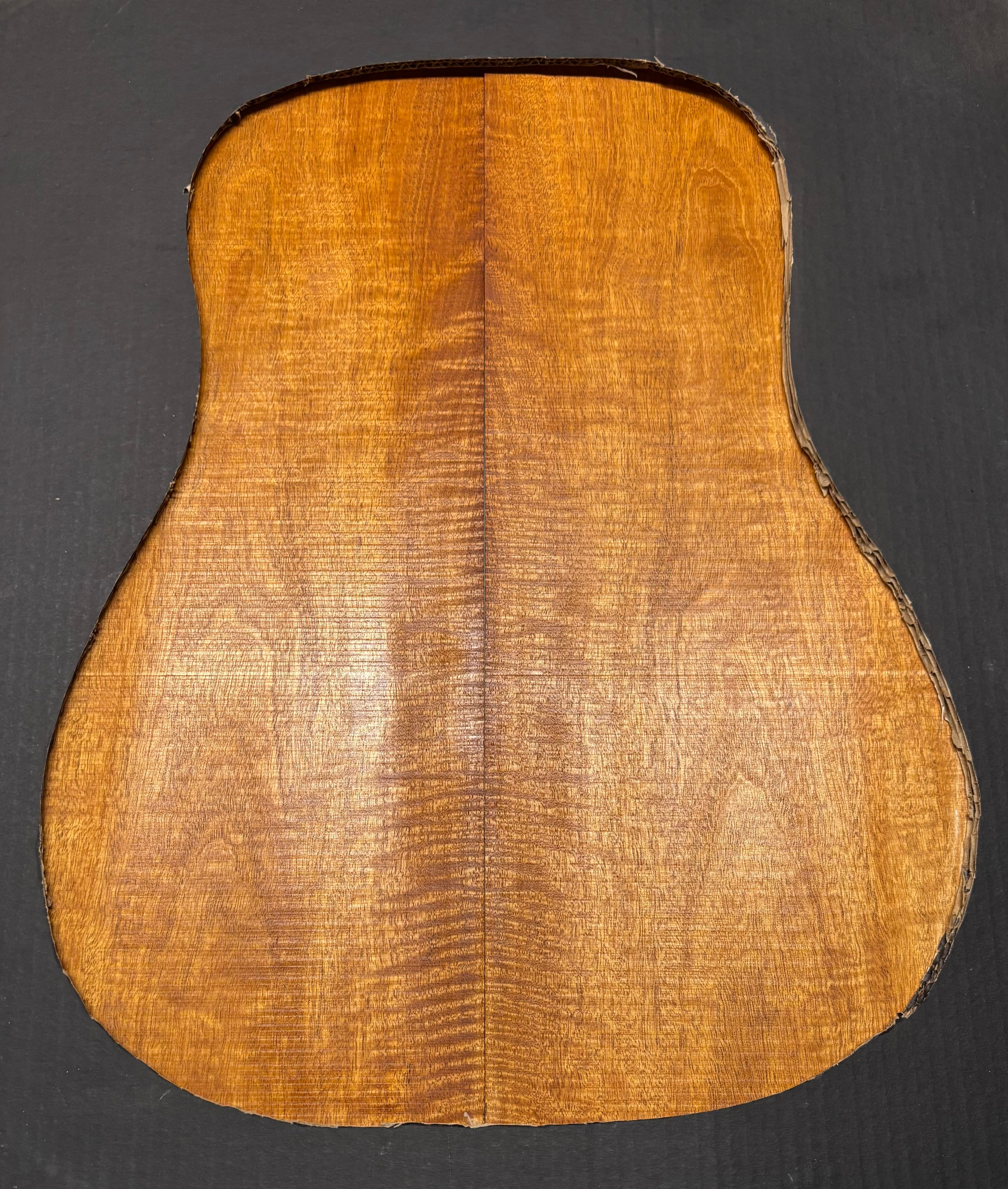 This Flame Mahogany Genuine Dreadnought Guitar Back Set showcases striking waterfall and ribbon figure with warm reddish-brown tones, offering excellent clarity, punchy mids, and smooth sustain. Its stable, workable grain makes it ideal for luthiers seeking a visually captivating and tonally balanced tonewood for custom dreadnought builds.