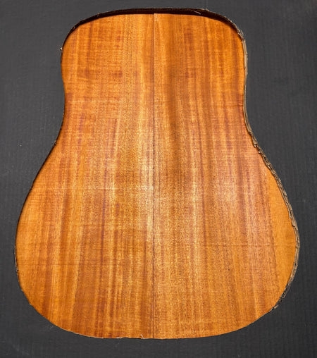 This Flame Mahogany Genuine Dreadnought Guitar Back & Side Set showcases striking waterfall and ribbon figure with warm reddish-brown tones, offering excellent clarity, punchy mids, and smooth sustain. Its stable, workable grain makes it ideal for luthiers seeking a visually captivating and tonally balanced tonewood for custom dreadnought builds.