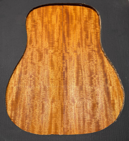 This Flame Mahogany Genuine Dreadnought Guitar Back & Side Set showcases striking waterfall and ribbon figure with warm reddish-brown tones, offering excellent clarity, punchy mids, and smooth sustain. Its stable, workable grain makes it ideal for luthiers seeking a visually captivating and tonally balanced tonewood for custom dreadnought builds.