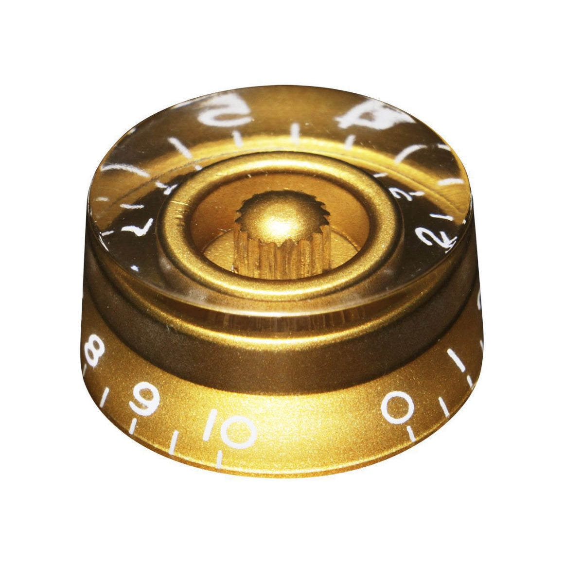 Authentic Gibson-style speed control knob with press-on mounting for US inch potentiometers. Features a 24-tooth knurled insert designed specifically for 1/4" (6.35mm) shafts with 24 teeth. The transparent black plastic maintains classic aesthetics while providing precise grip and control.