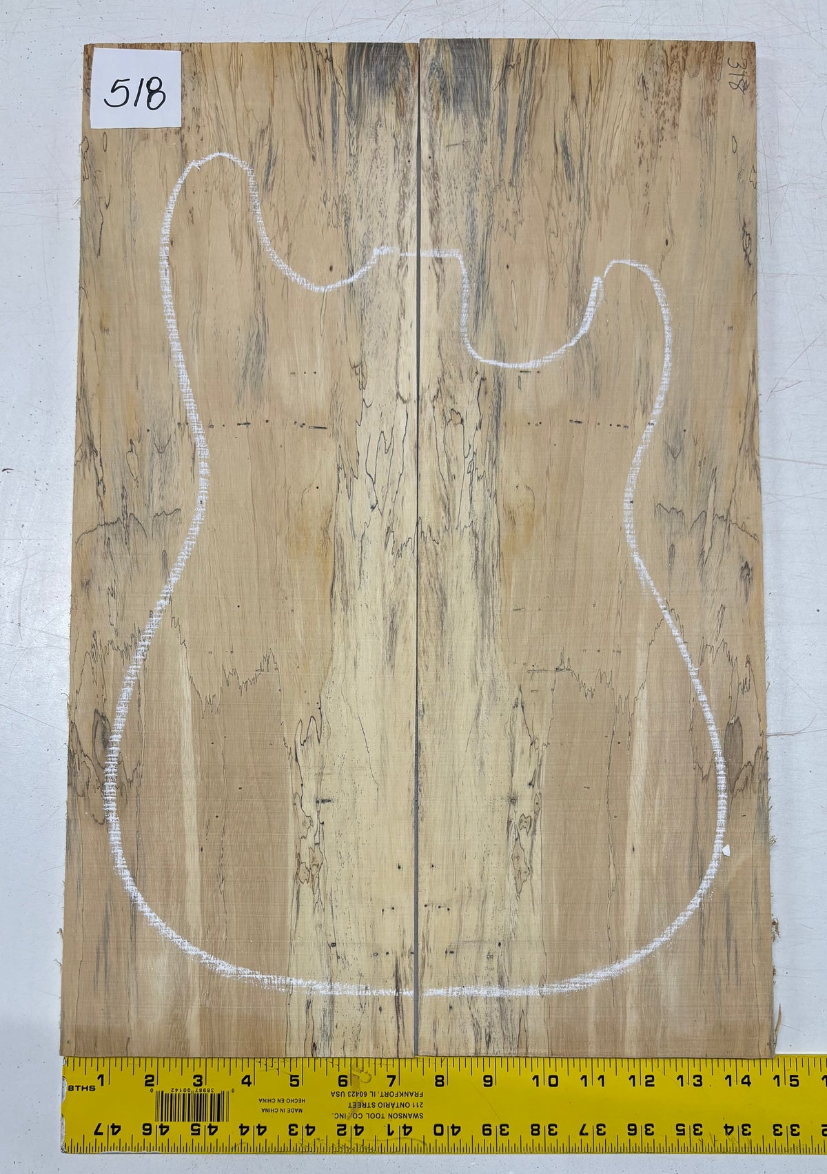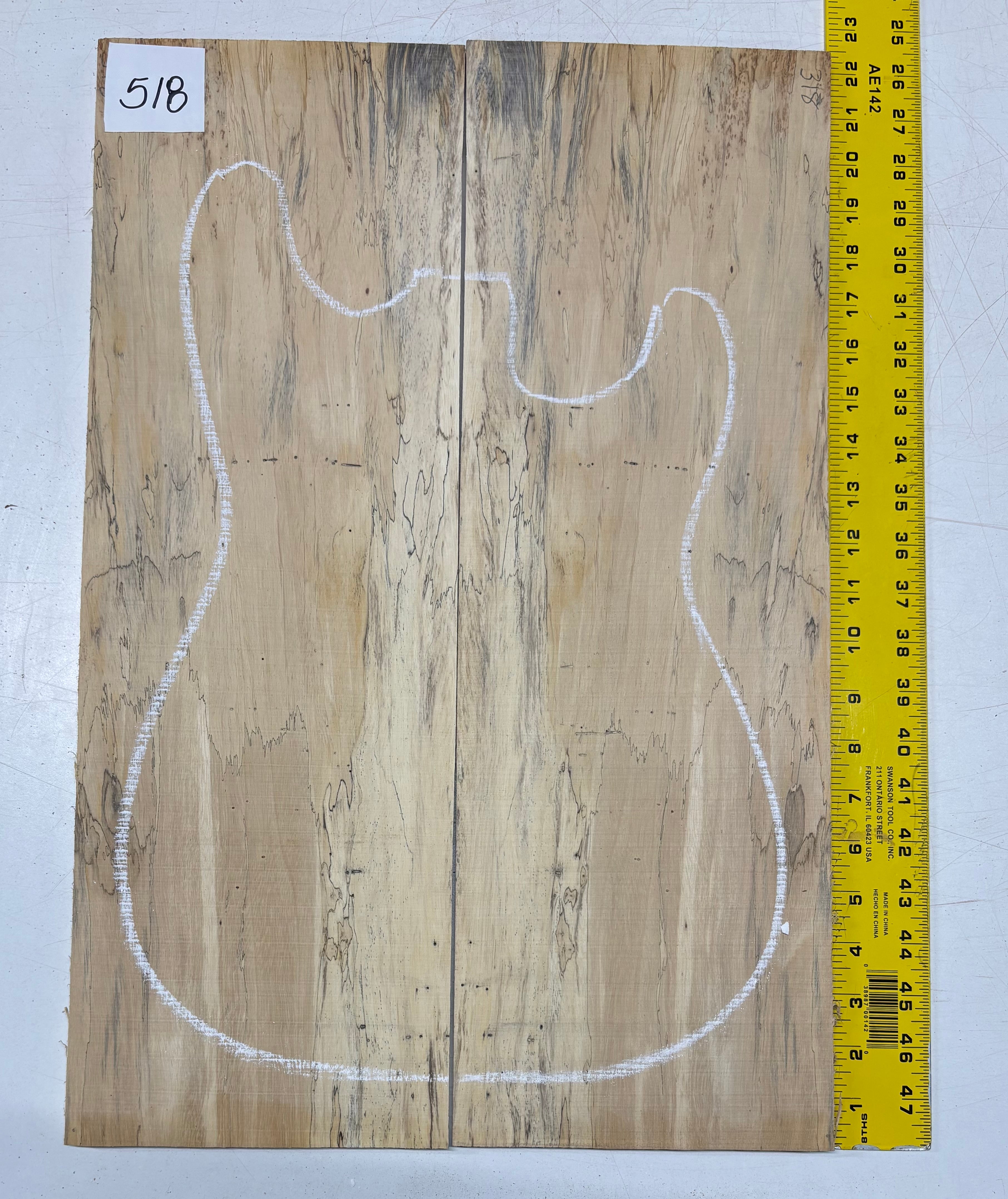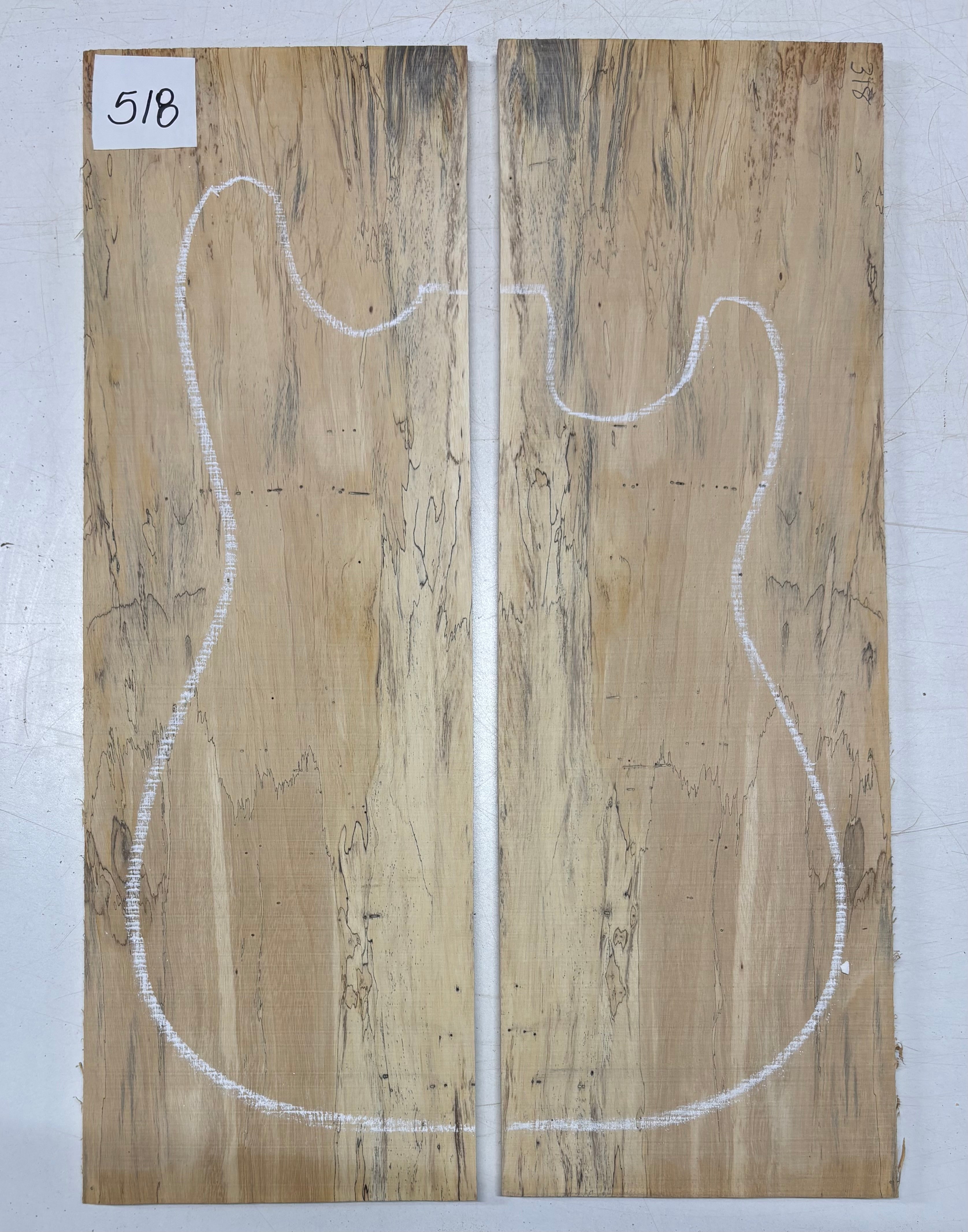Turn heads with this stunning Spalted Tamarind Drop Top, a rare and exotic bookmatched set that showcases nature's artwork in bold, expressive grain. The creamy blonde base is streaked with dramatic gray and black spalting, creating a marbled, flame-like centerpiece down the middle—ideal for a statement electric or acoustic guitar top. This set offers a blend of visual impact and excellent workability.