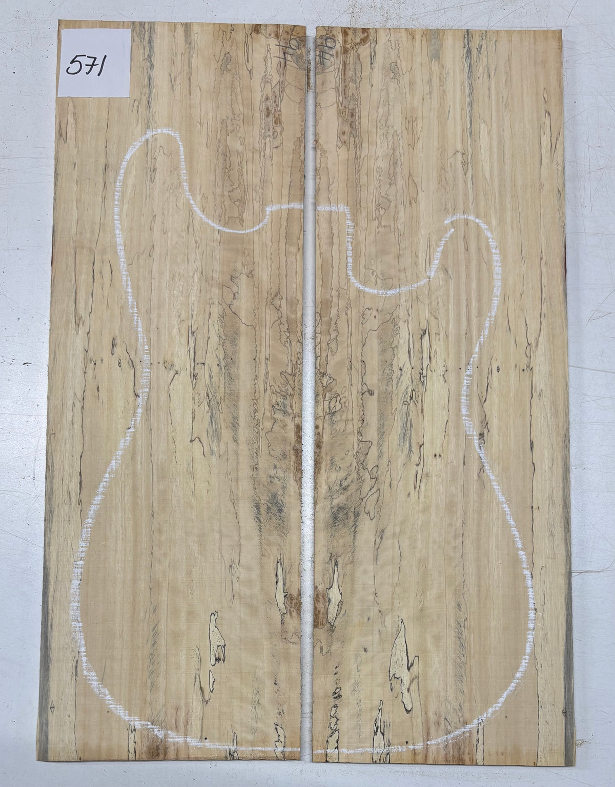Turn heads with this stunning Spalted Tamarind Drop Top, a rare and exotic bookmatched set that showcases nature's artwork in bold, expressive grain. The creamy blonde base is streaked with dramatic gray and black spalting, creating a marbled, flame-like centerpiece down the middle—ideal for a statement electric or acoustic guitar top. This set offers a blend of visual impact and excellent workability.