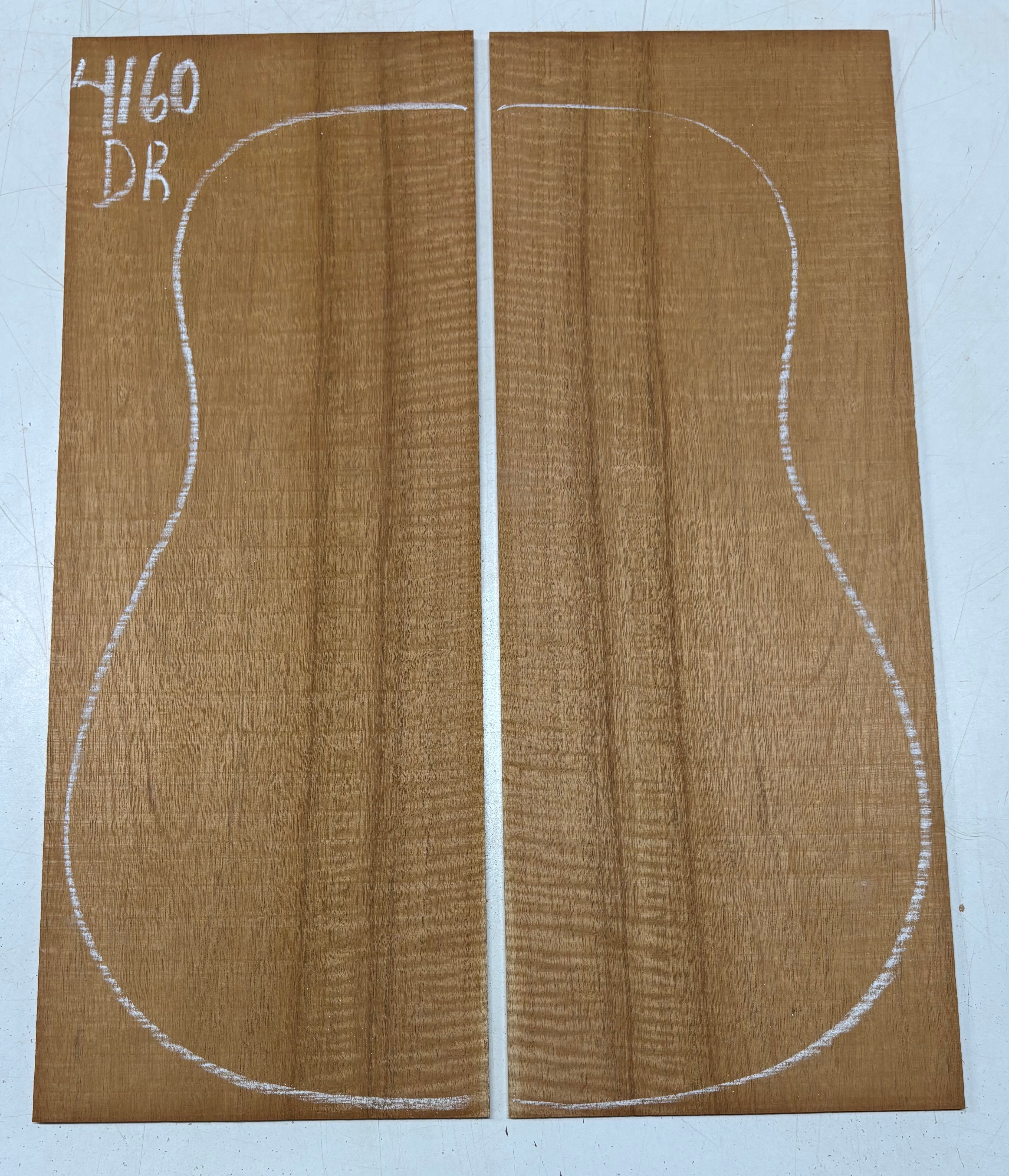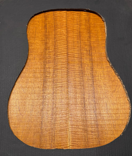 This Flame Mahogany Genuine Dreadnought Guitar Back Set showcases striking waterfall and ribbon figure with warm reddish-brown tones, offering excellent clarity, punchy mids, and smooth sustain. Its stable, workable grain makes it ideal for luthiers seeking a visually captivating and tonally balanced tonewood for custom dreadnought builds.