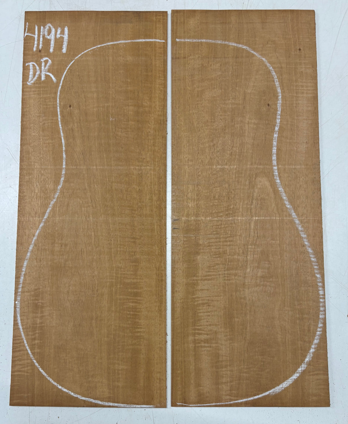 This Flame Mahogany Genuine Dreadnought Guitar Back Set showcases striking waterfall and ribbon figure with warm reddish-brown tones, offering excellent clarity, punchy mids, and smooth sustain. Its stable, workable grain makes it ideal for luthiers seeking a visually captivating and tonally balanced tonewood for custom dreadnought builds.