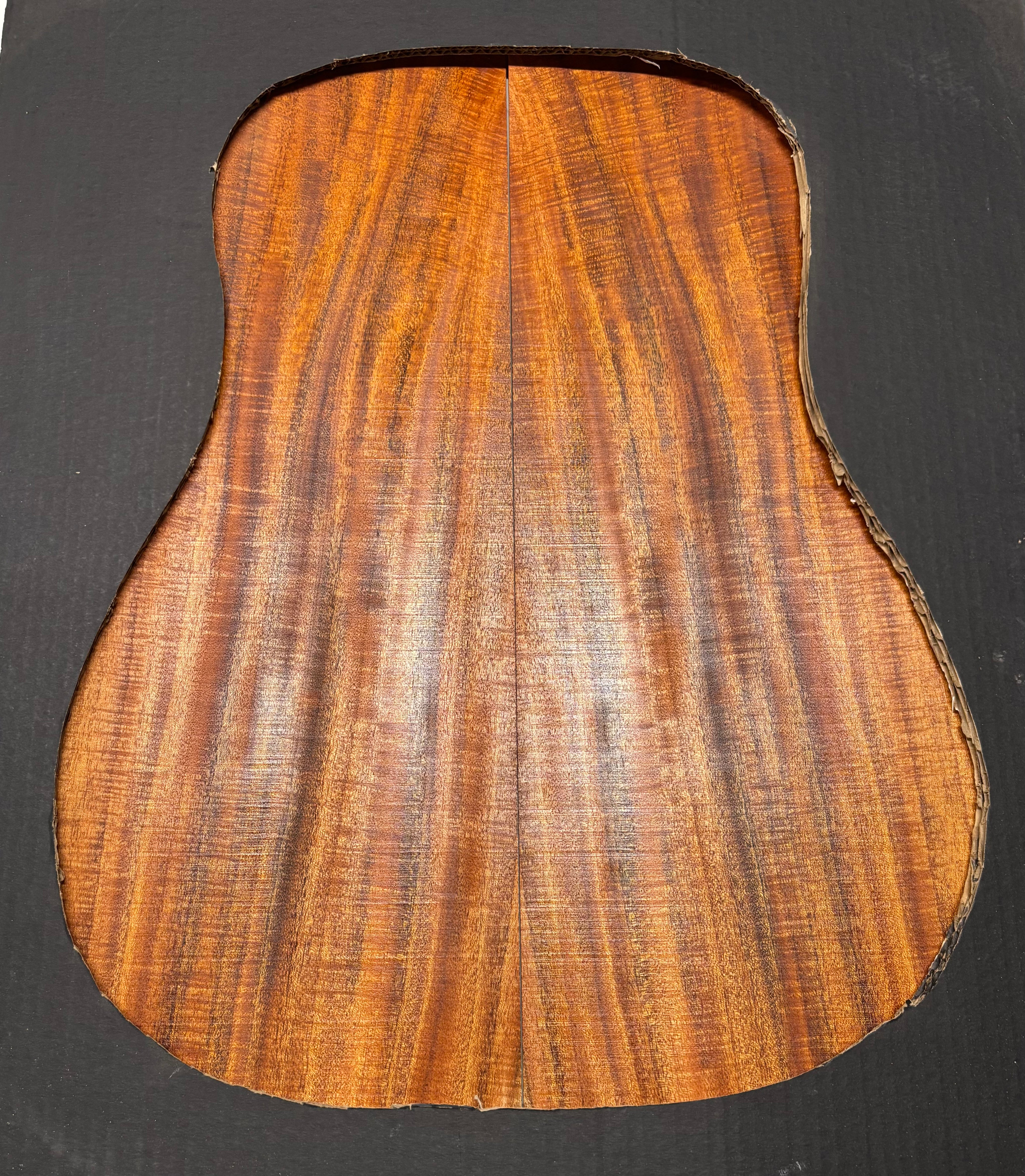 This Flame Mahogany Genuine Dreadnought Guitar Back & Side Set showcases striking waterfall and ribbon figure with warm reddish-brown tones, offering excellent clarity, punchy mids, and smooth sustain. Its stable, workable grain makes it ideal for luthiers seeking a visually captivating and tonally balanced tonewood for custom dreadnought builds.