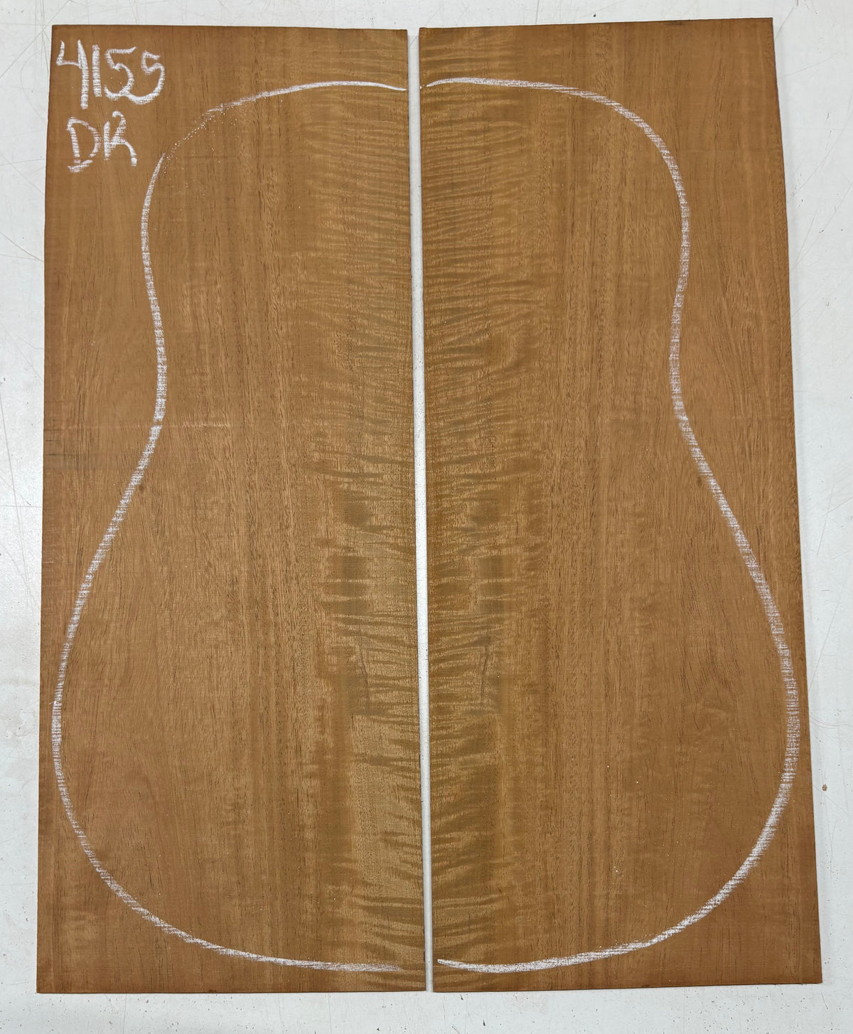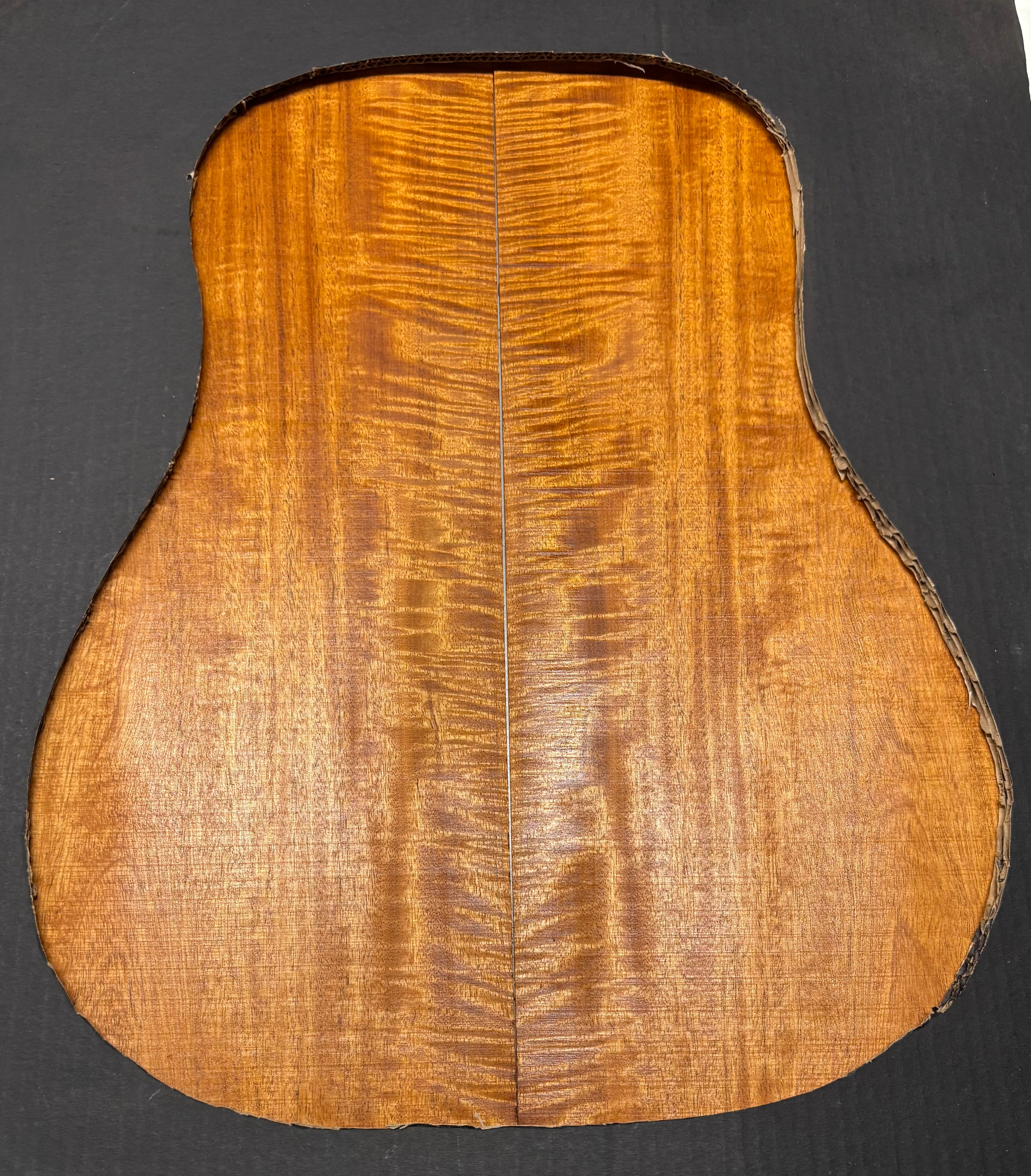 This Flame Mahogany Genuine Dreadnought Guitar Back Set showcases striking waterfall and ribbon figure with warm reddish-brown tones, offering excellent clarity, punchy mids, and smooth sustain. Its stable, workable grain makes it ideal for luthiers seeking a visually captivating and tonally balanced tonewood for custom dreadnought builds.