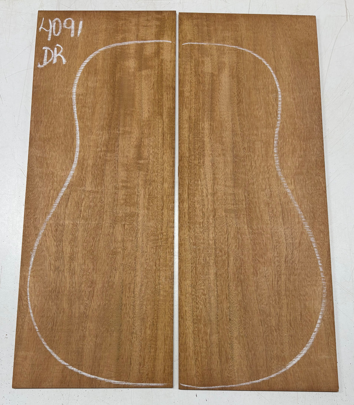 This Flame Mahogany Genuine Dreadnought Guitar Back Set showcases striking waterfall and ribbon figure with warm reddish-brown tones, offering excellent clarity, punchy mids, and smooth sustain. Its stable, workable grain makes it ideal for luthiers seeking a visually captivating and tonally balanced tonewood for custom dreadnought builds.