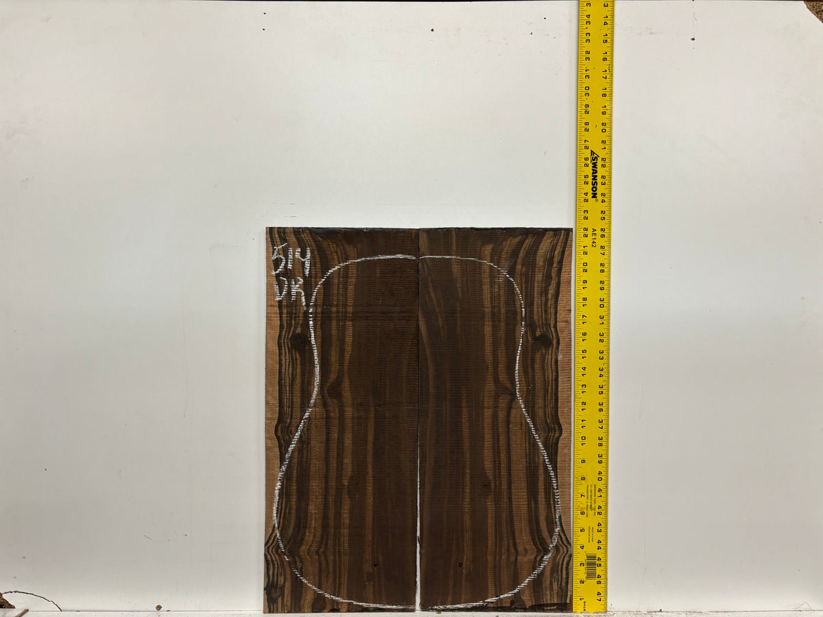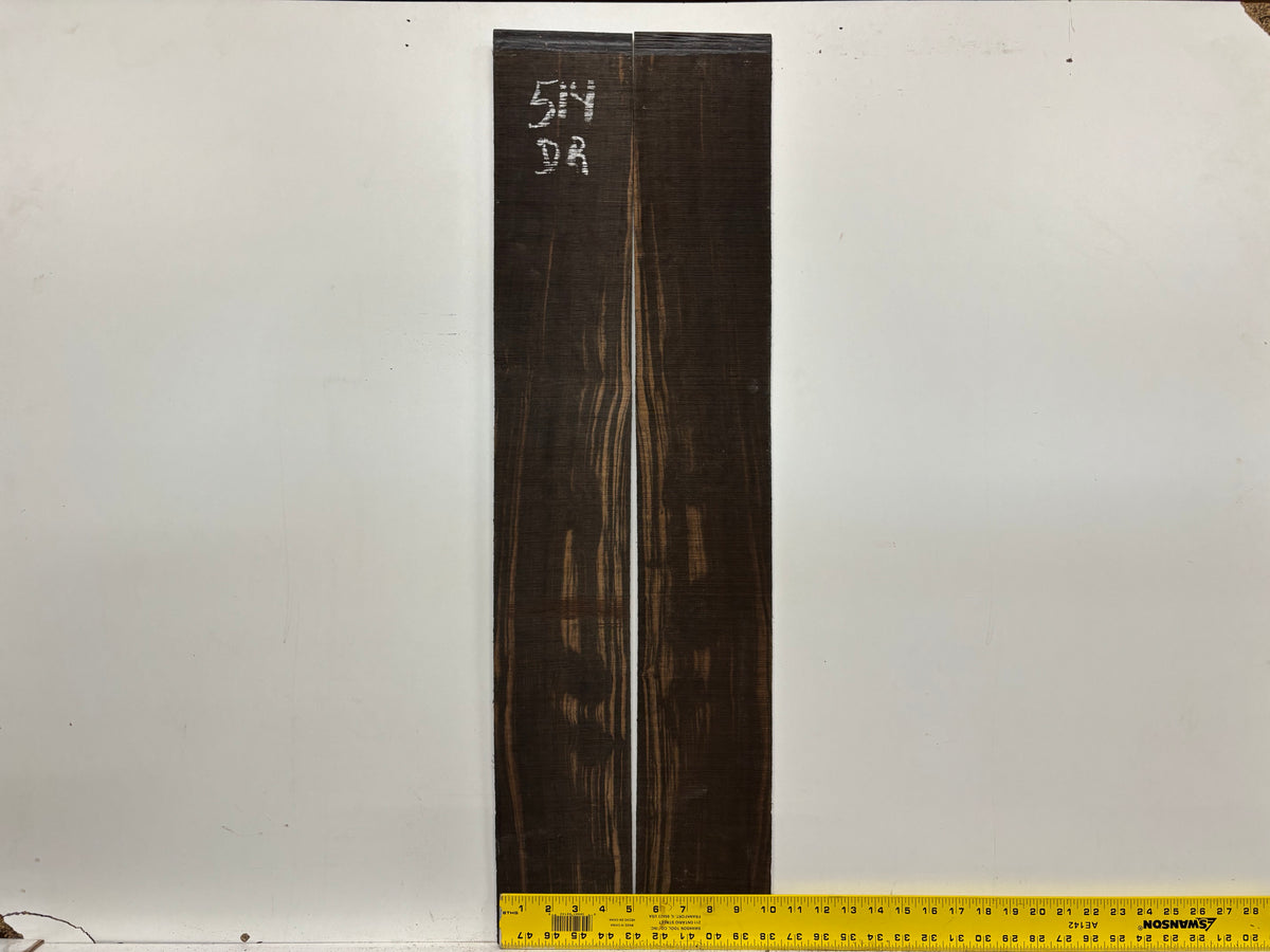 Macassar Ebony Dreadnought Guitar Back & Side Sets deliver a bold, high-contrast look with dark chocolate stripes over golden-brown streaks, giving any custom build a premium, exotic appearance. Known for its dense structure and ringing tap tone, Macassar Ebony provides strong low-end depth, clear mids, and crisp, articulate highs — perfect for powerful dreadnought projection.