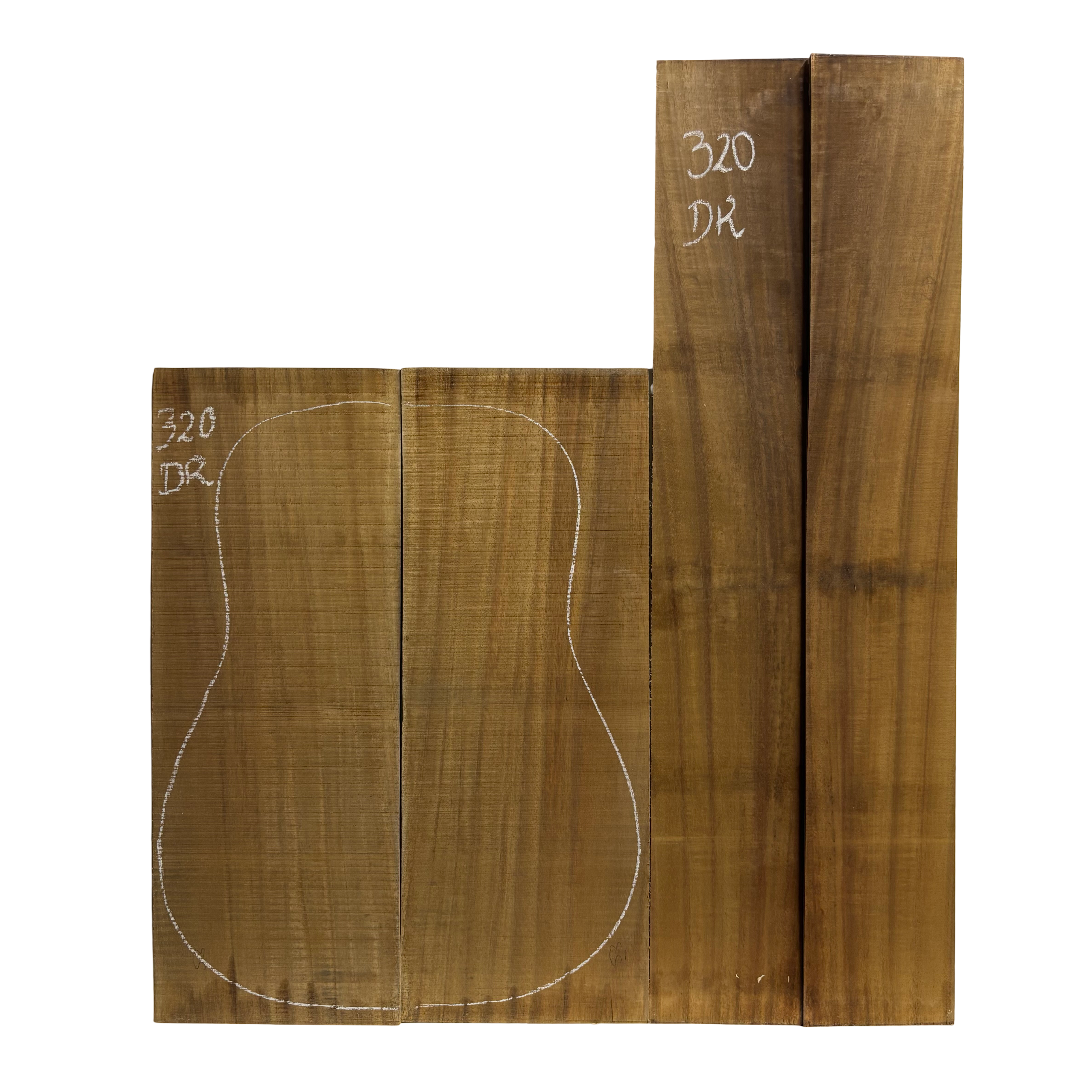 Acacia’s golden to reddish-brown tones, paired with dark, streaked grain, give each set a natural elegance. Known for its crisp highs, warm mids, and excellent projection, Acacia is a go-to tonewood for dreadnought builds that demand clarity and presence. Its excellent stability and easy workability make it a luthier-friendly option for both seasoned and custom builders.