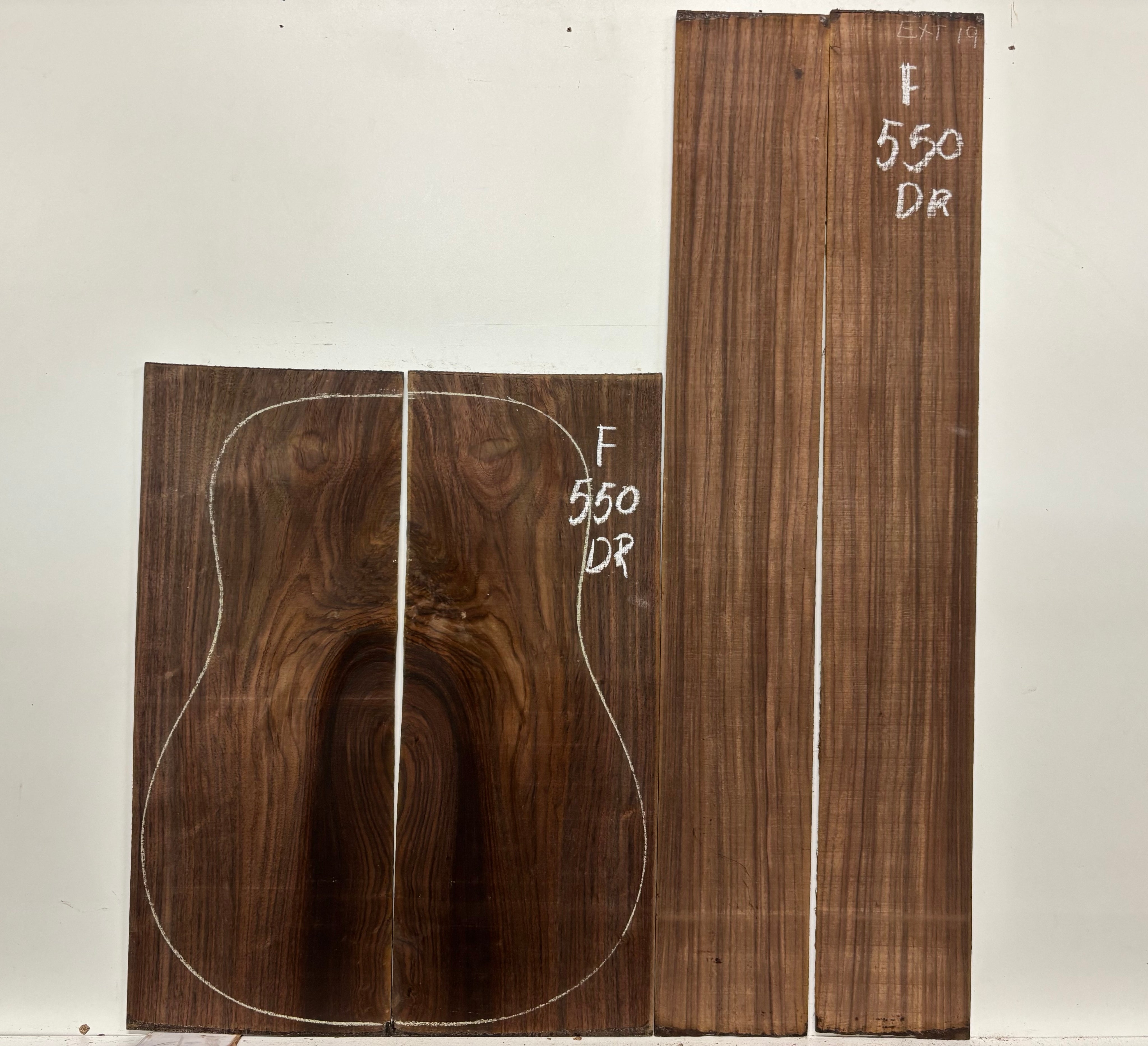 A premium Figured Indian Rosewood Dreadnought Back and Side Set featuring striking grain patterns and rich tonal warmth, ideal for building high-end dreadnought guitars. This set offers excellent resonance, deep bass response, and visual beauty, making it perfect for luthiers and guitar builders seeking quality Indian Rosewood with figured aesthetics.