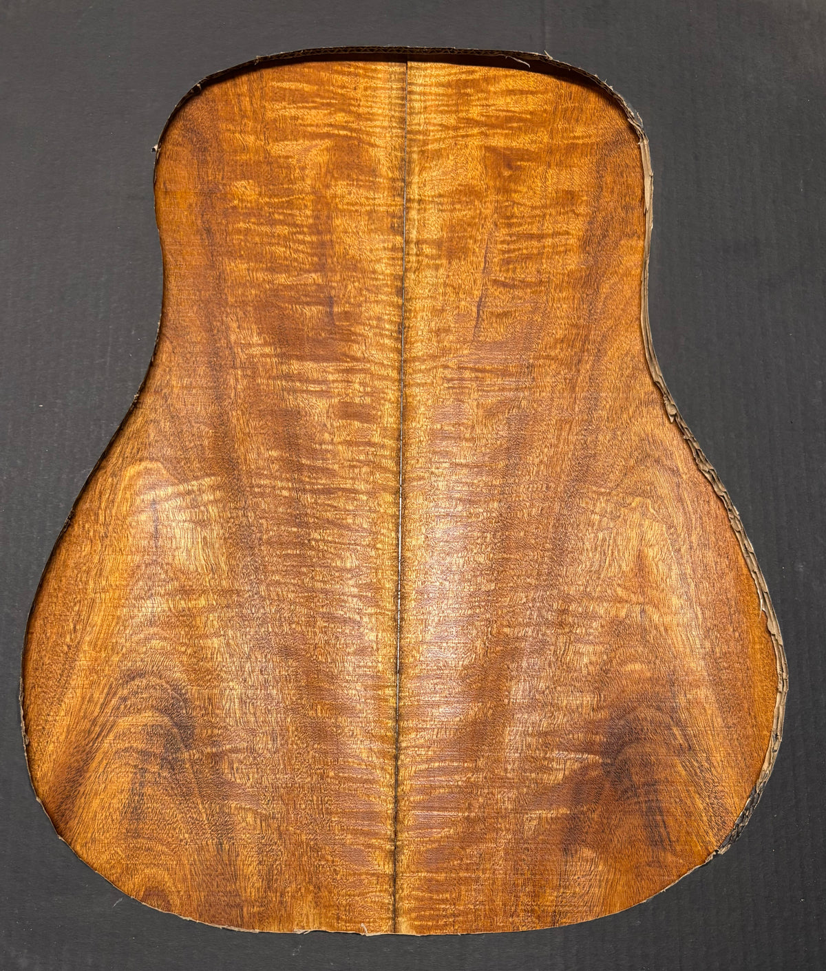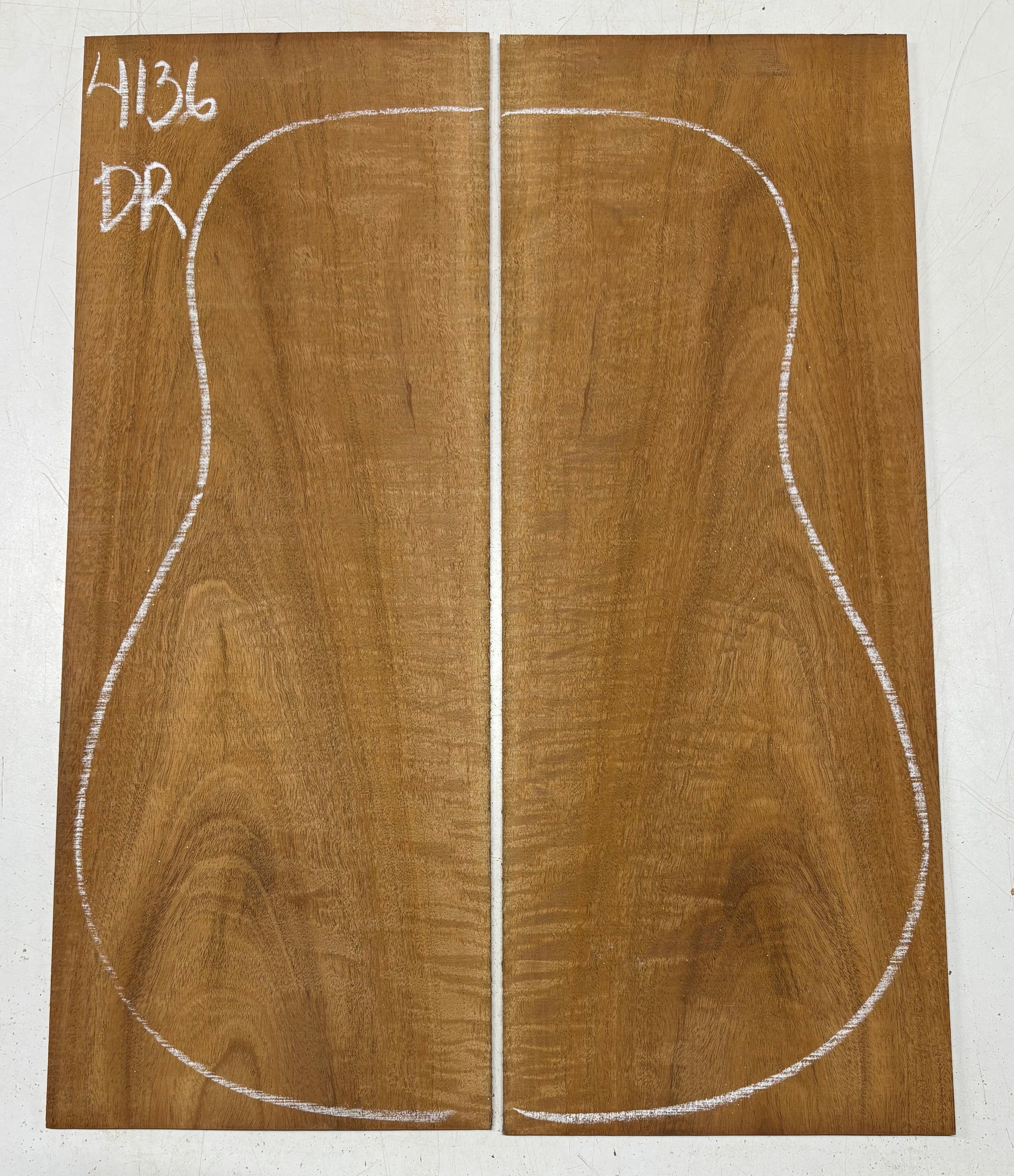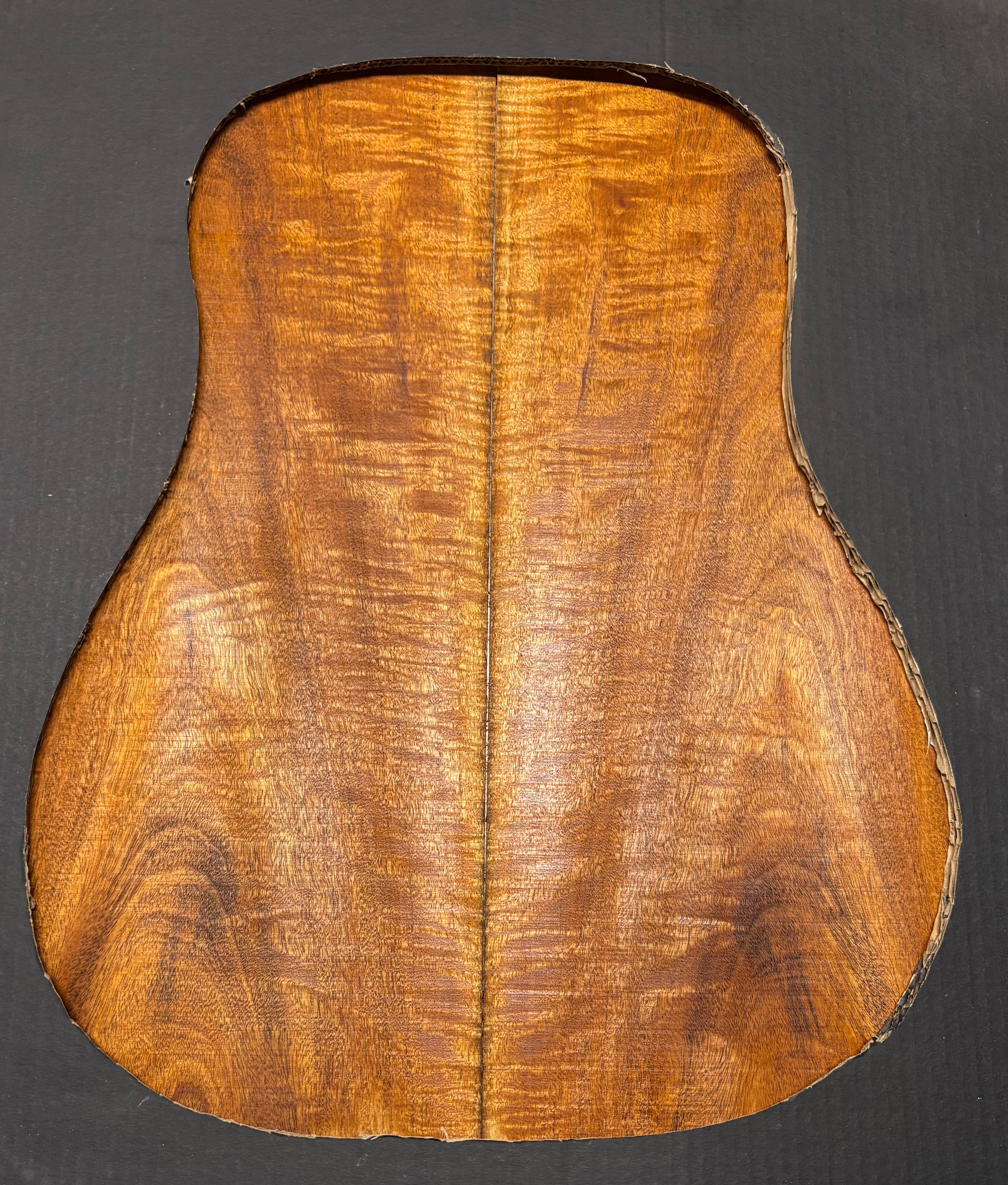 This Flame Mahogany Genuine Dreadnought Guitar Back Set showcases striking waterfall and ribbon figure with warm reddish-brown tones, offering excellent clarity, punchy mids, and smooth sustain. Its stable, workable grain makes it ideal for luthiers seeking a visually captivating and tonally balanced tonewood for custom dreadnought builds.