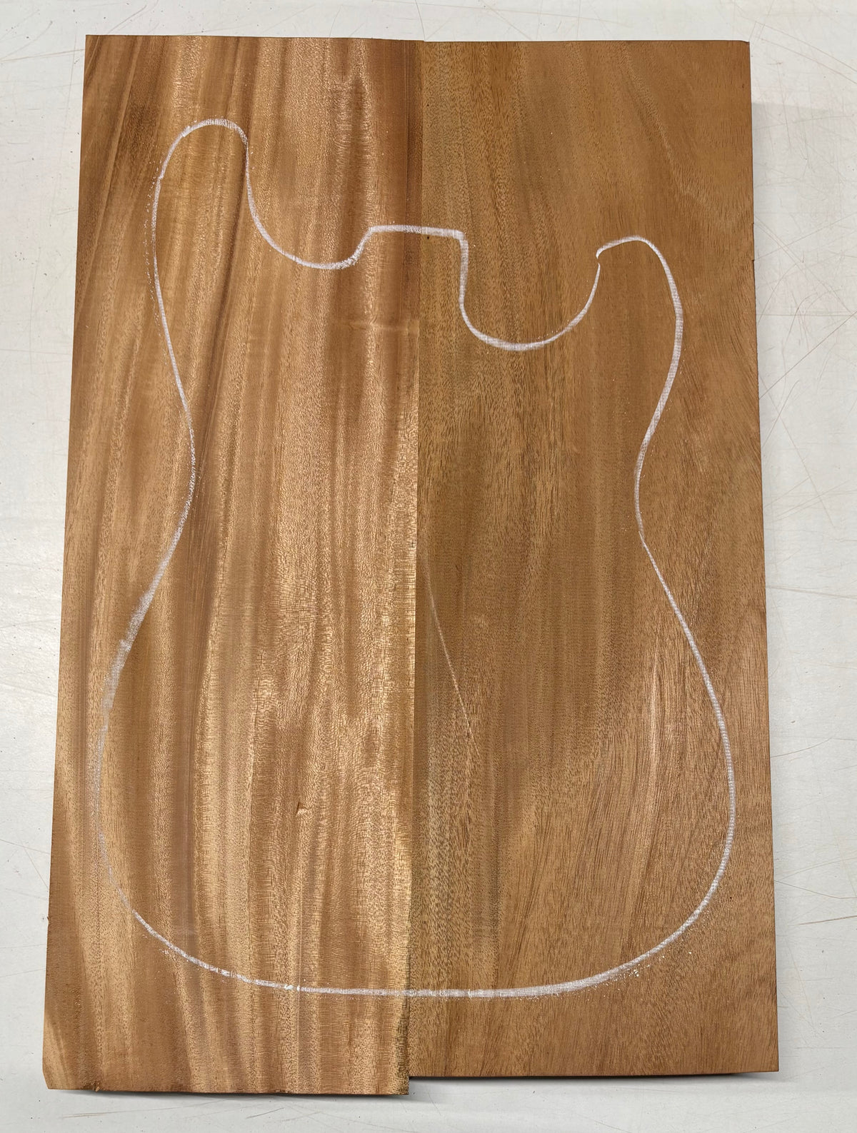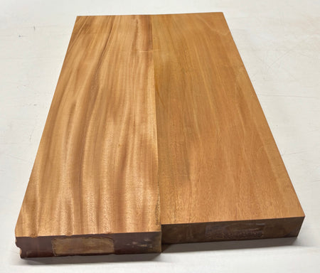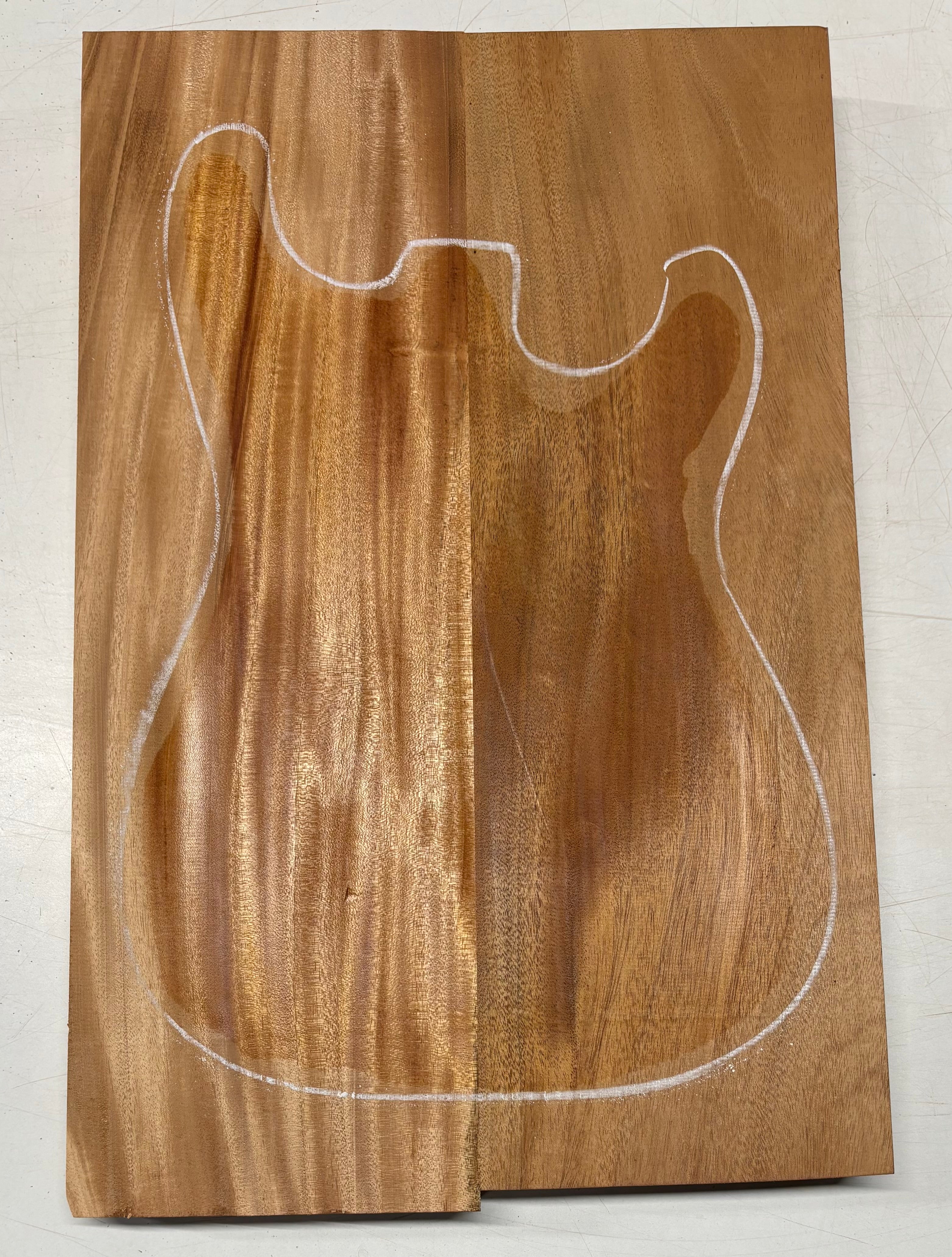 This body blank showcases a rich medium-brown to golden-brown color with subtle reddish undertones. The grain is predominantly straight with areas of light shimmer and interlocking figure, giving it both stability and visual depth. Carefully matched and glued from two pieces, it provides excellent strength and balance for guitar building. Mahogany is prized for its warm, resonant tone—delivering smooth lows, balanced mids, and a clear top end—making it a timeless choice for both electric and acoustic guitar bodies.