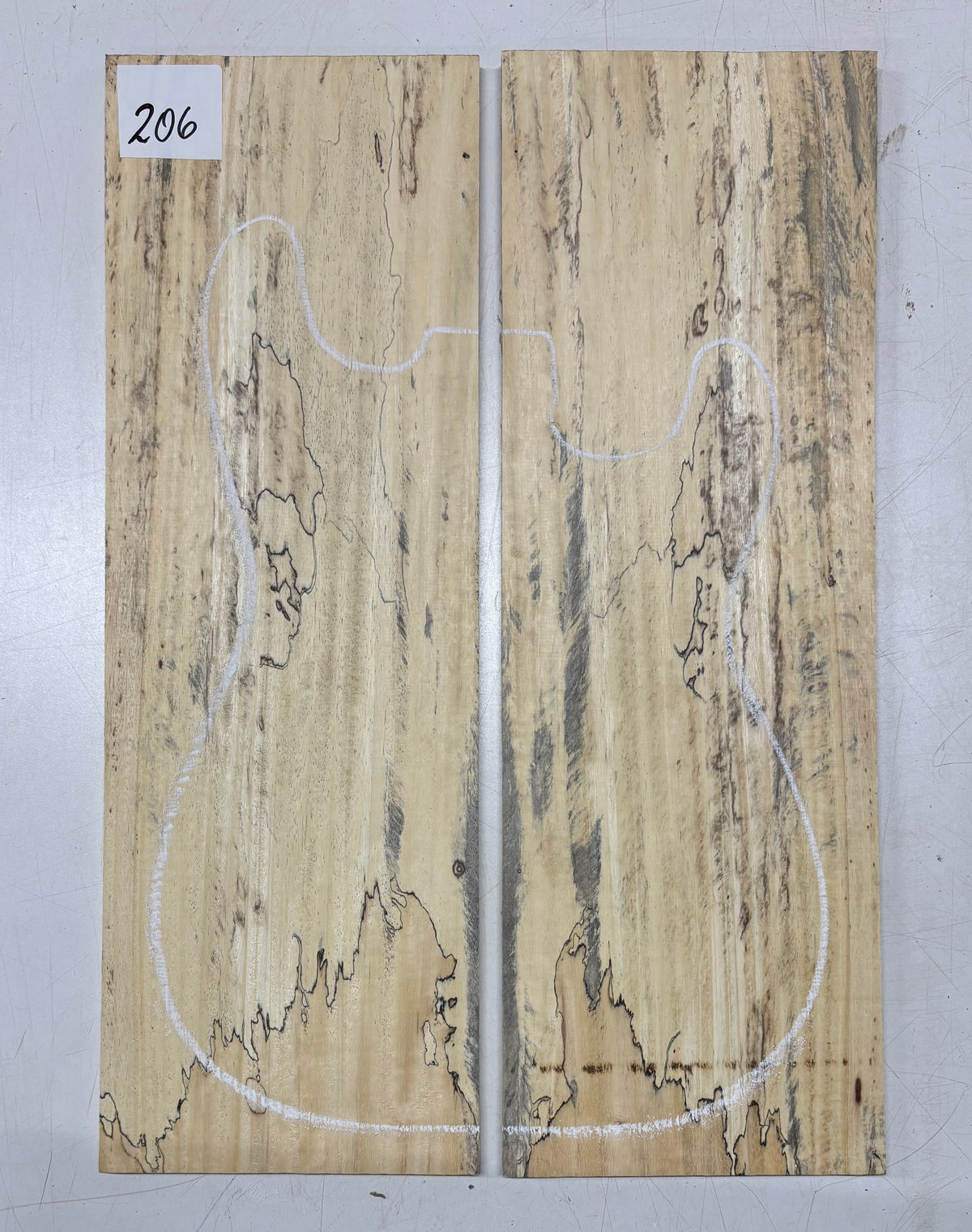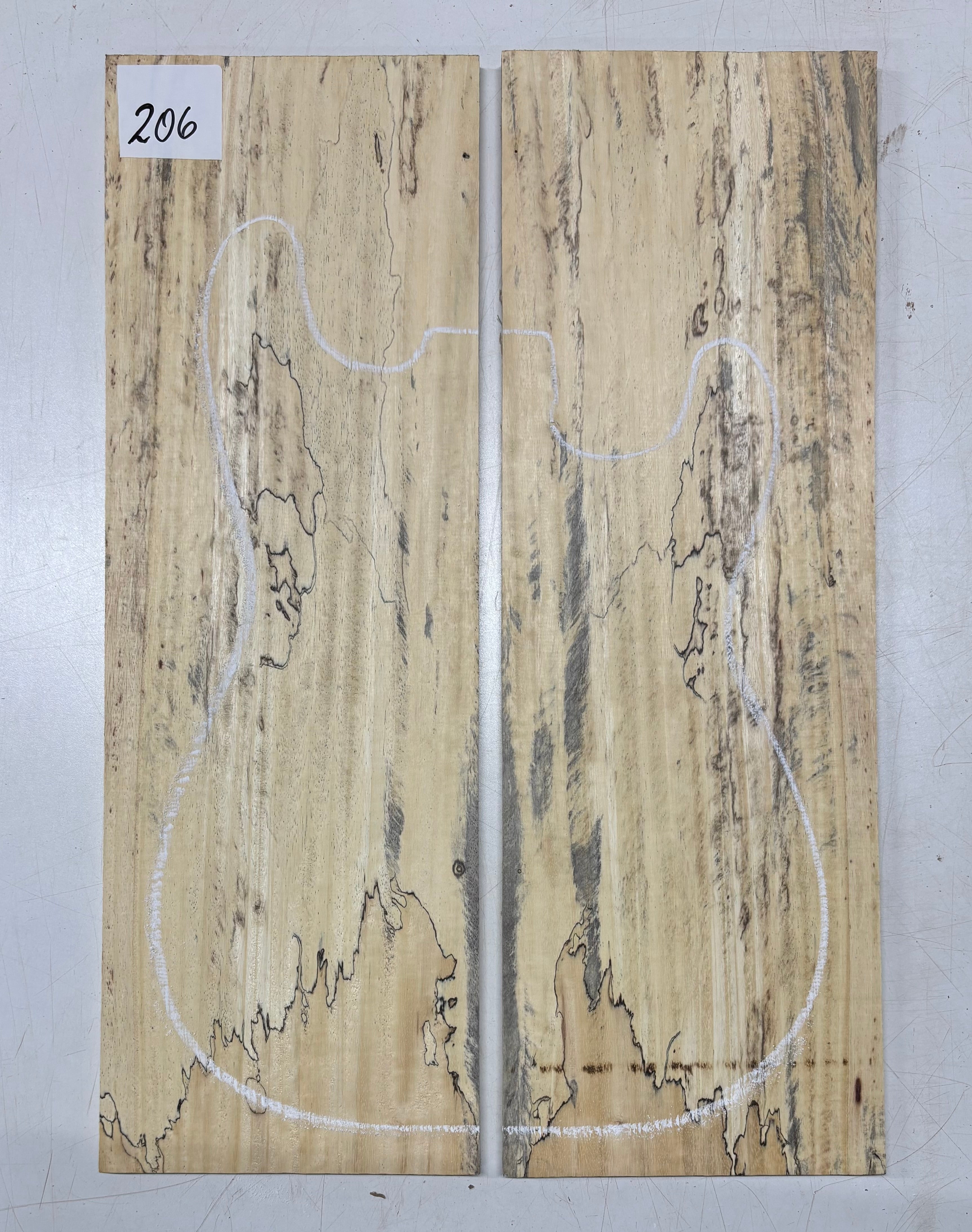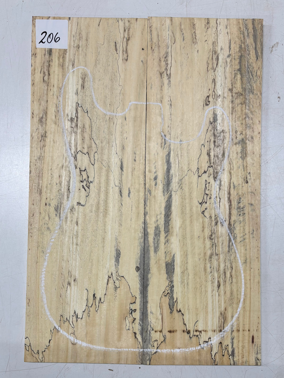 Turn heads with this stunning Spalted Tamarind Drop Top, a rare and exotic bookmatched set that showcases nature's artwork in bold, expressive grain. The creamy blonde base is streaked with dramatic gray and black spalting, creating a marbled, flame-like centerpiece down the middle—ideal for a statement electric or acoustic guitar top. This set offers a blend of visual impact and excellent workability.