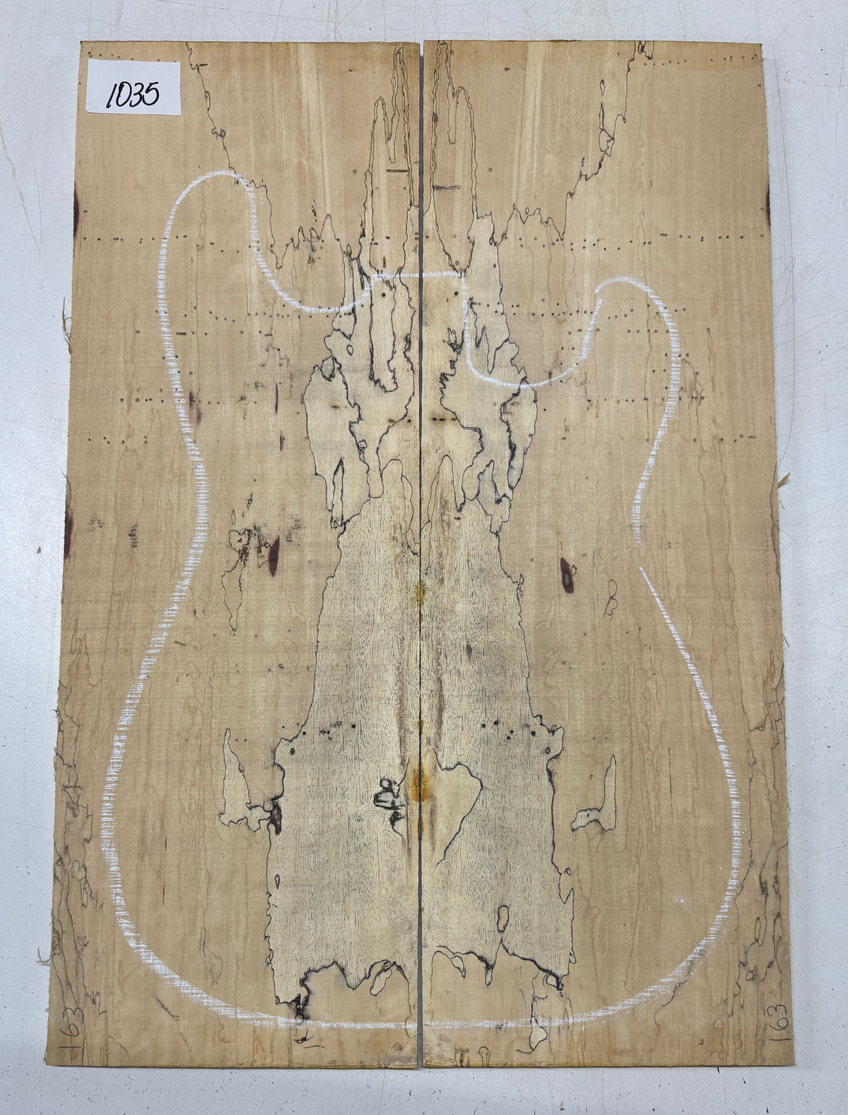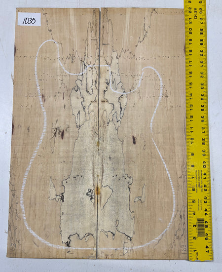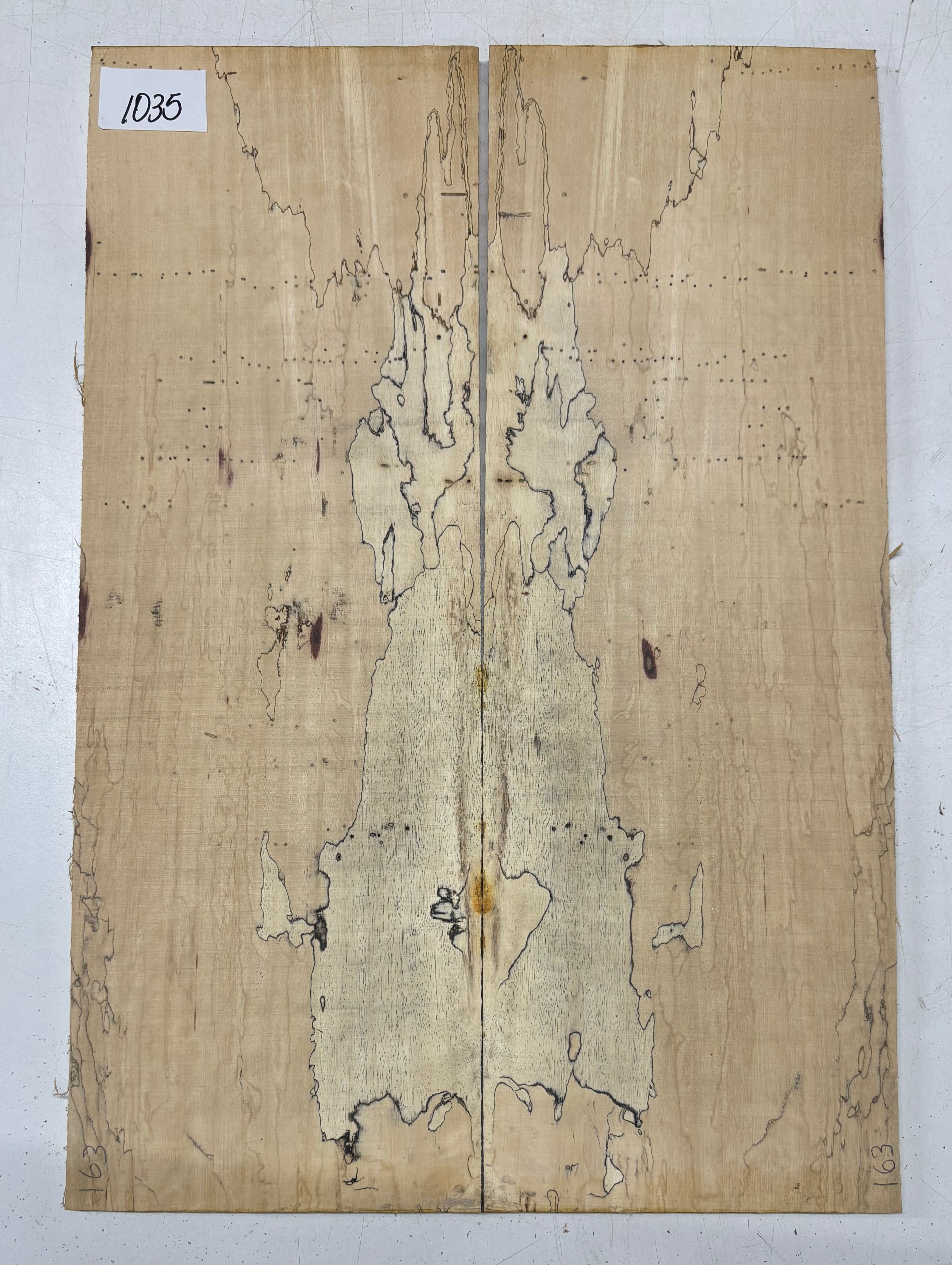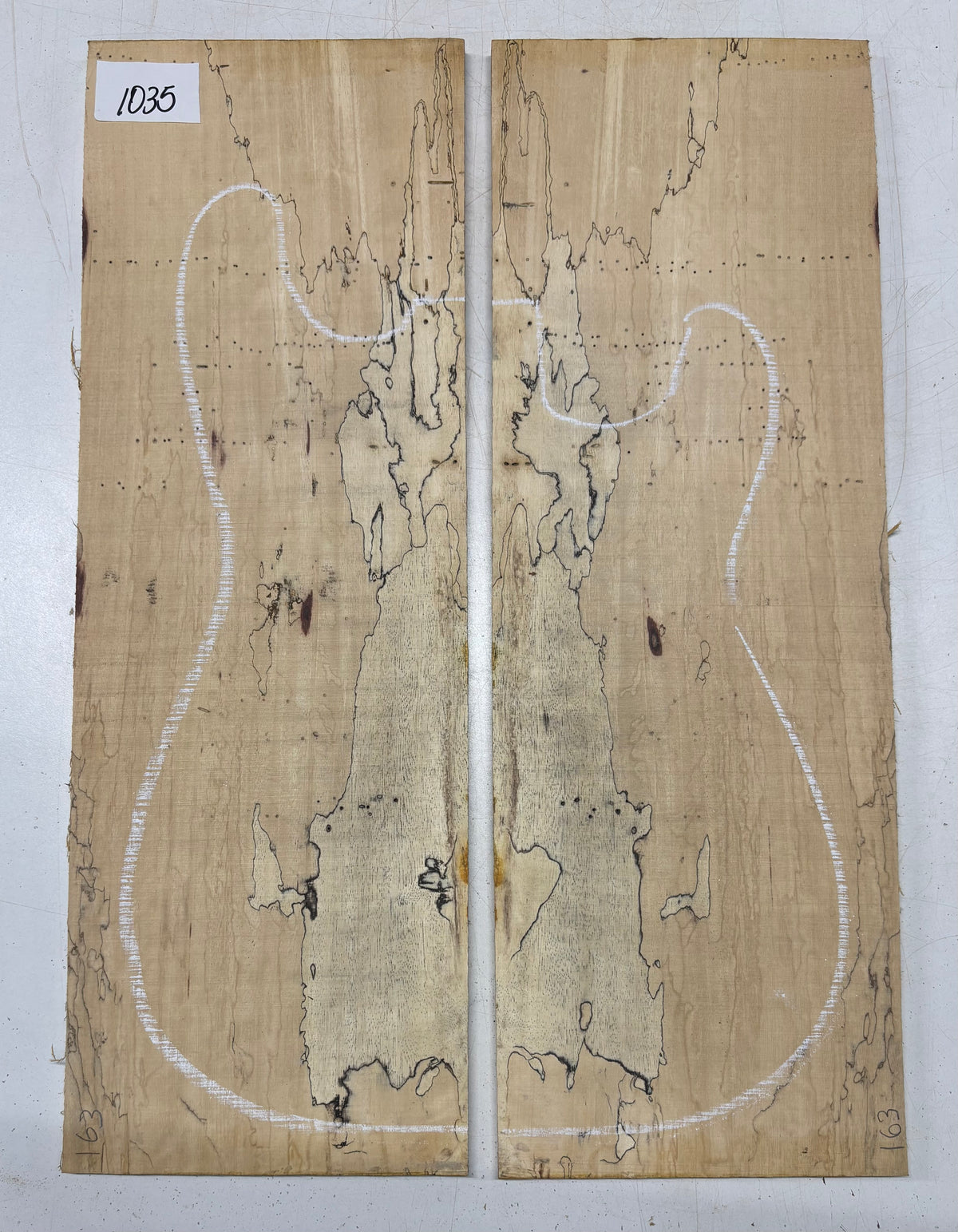 Turn heads with this stunning Spalted Tamarind Drop Top, a rare and exotic bookmatched set that showcases nature's artwork in bold, expressive grain. The creamy blonde base is streaked with dramatic gray and black spalting, creating a marbled, flame-like centerpiece down the middle—ideal for a statement electric or acoustic guitar top. This set offers a blend of visual impact and excellent workability.