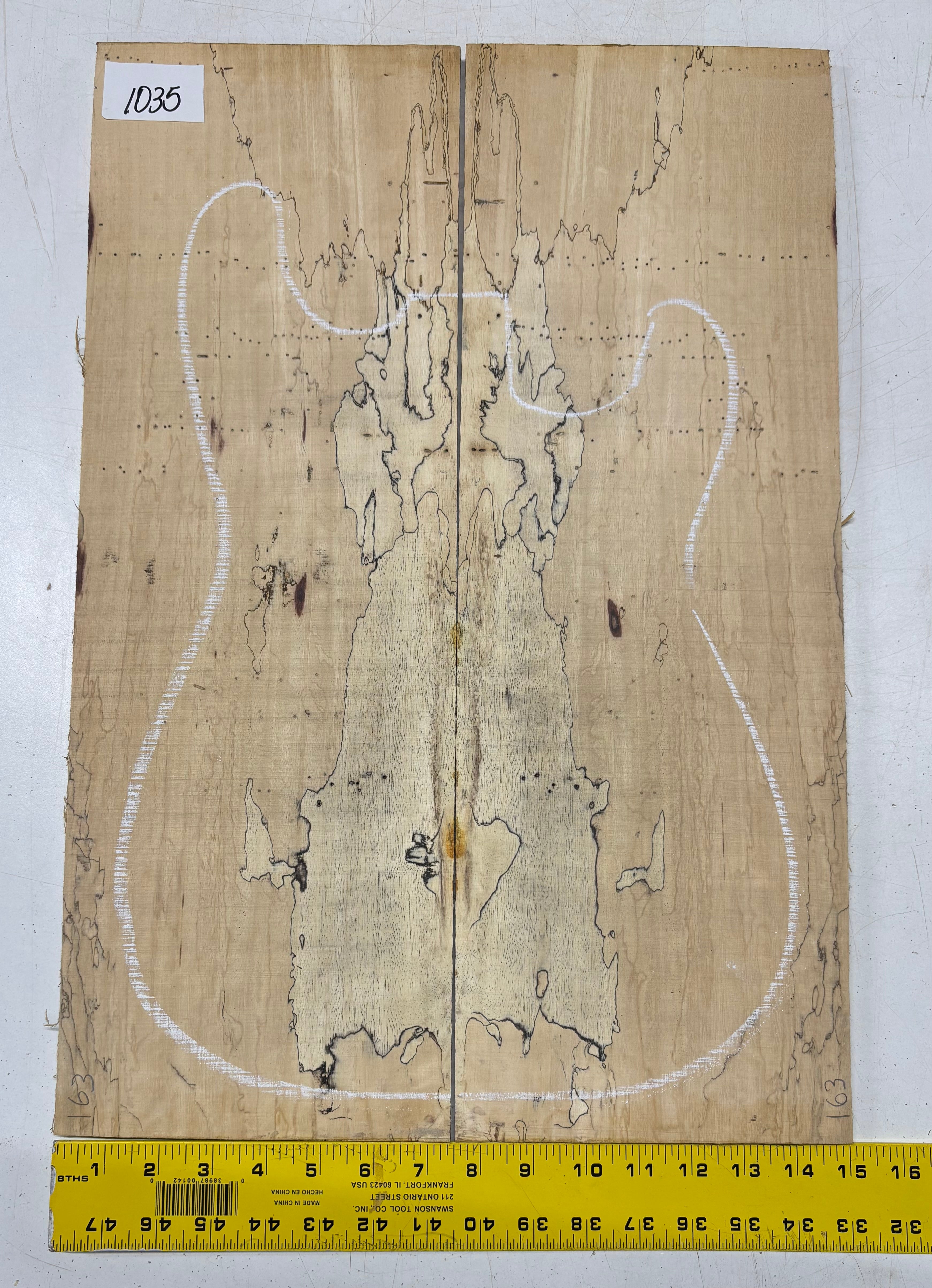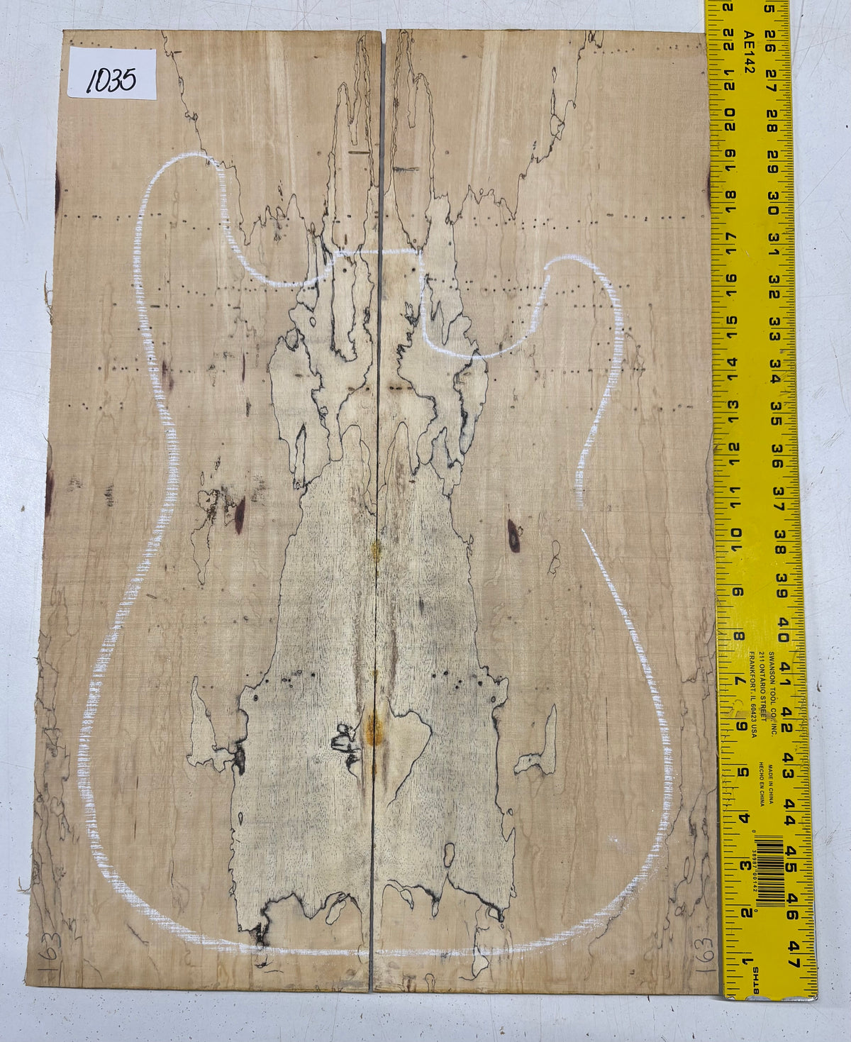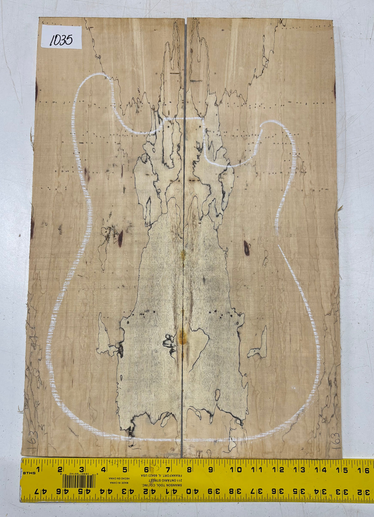 Turn heads with this stunning Spalted Tamarind Drop Top, a rare and exotic bookmatched set that showcases nature's artwork in bold, expressive grain. The creamy blonde base is streaked with dramatic gray and black spalting, creating a marbled, flame-like centerpiece down the middle—ideal for a statement electric or acoustic guitar top. This set offers a blend of visual impact and excellent workability.