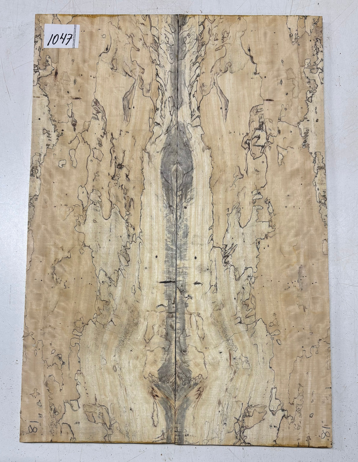 • Grain & Color: Pale golden-beige base with dramatic black spalting lines and streaks, forming intricate, web-like grain patterns.