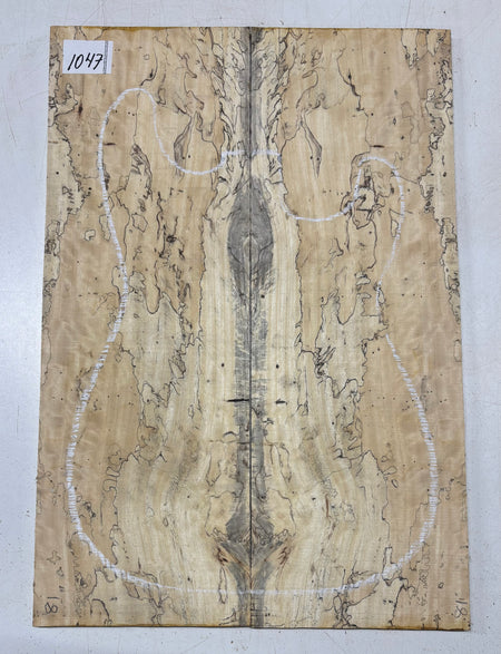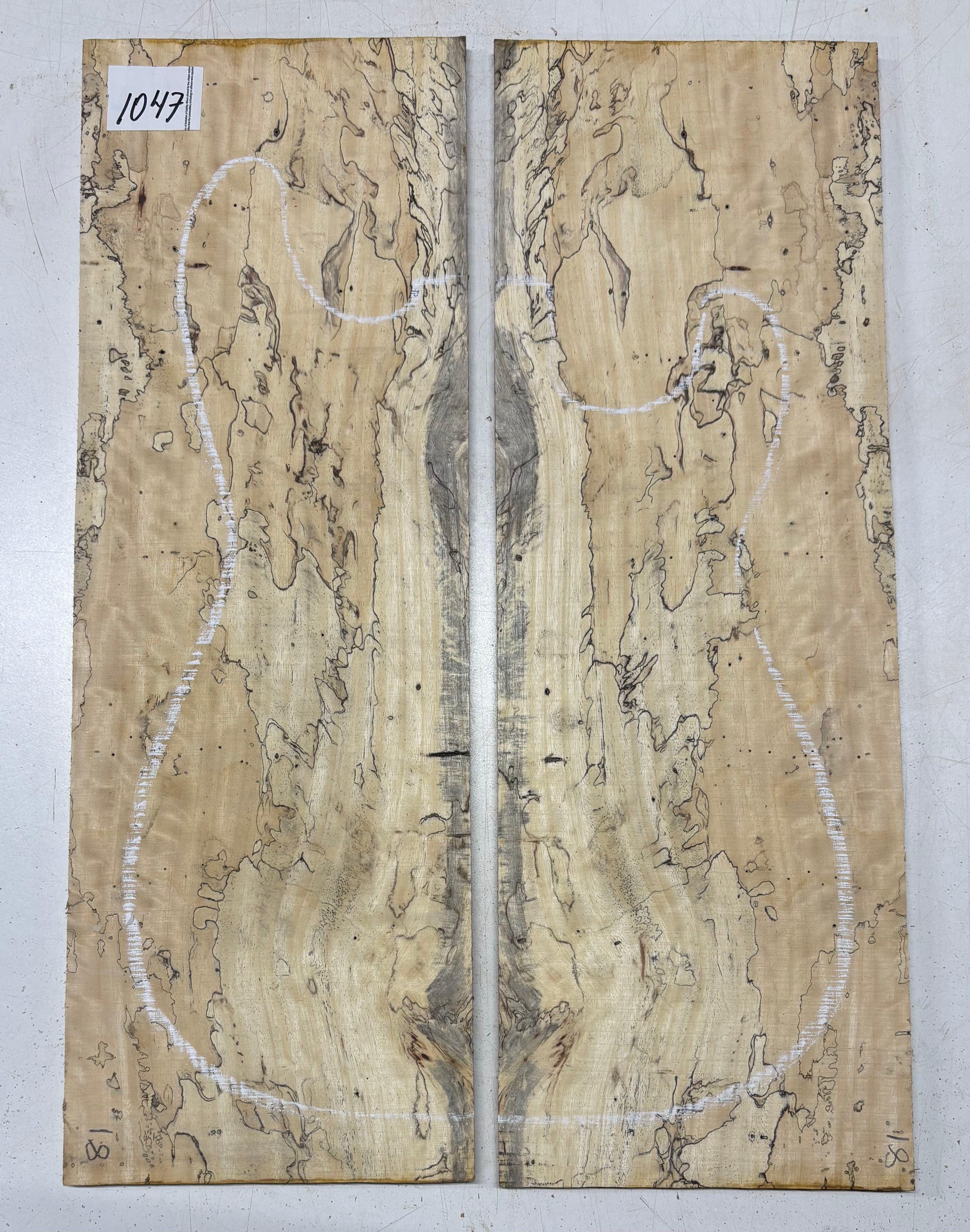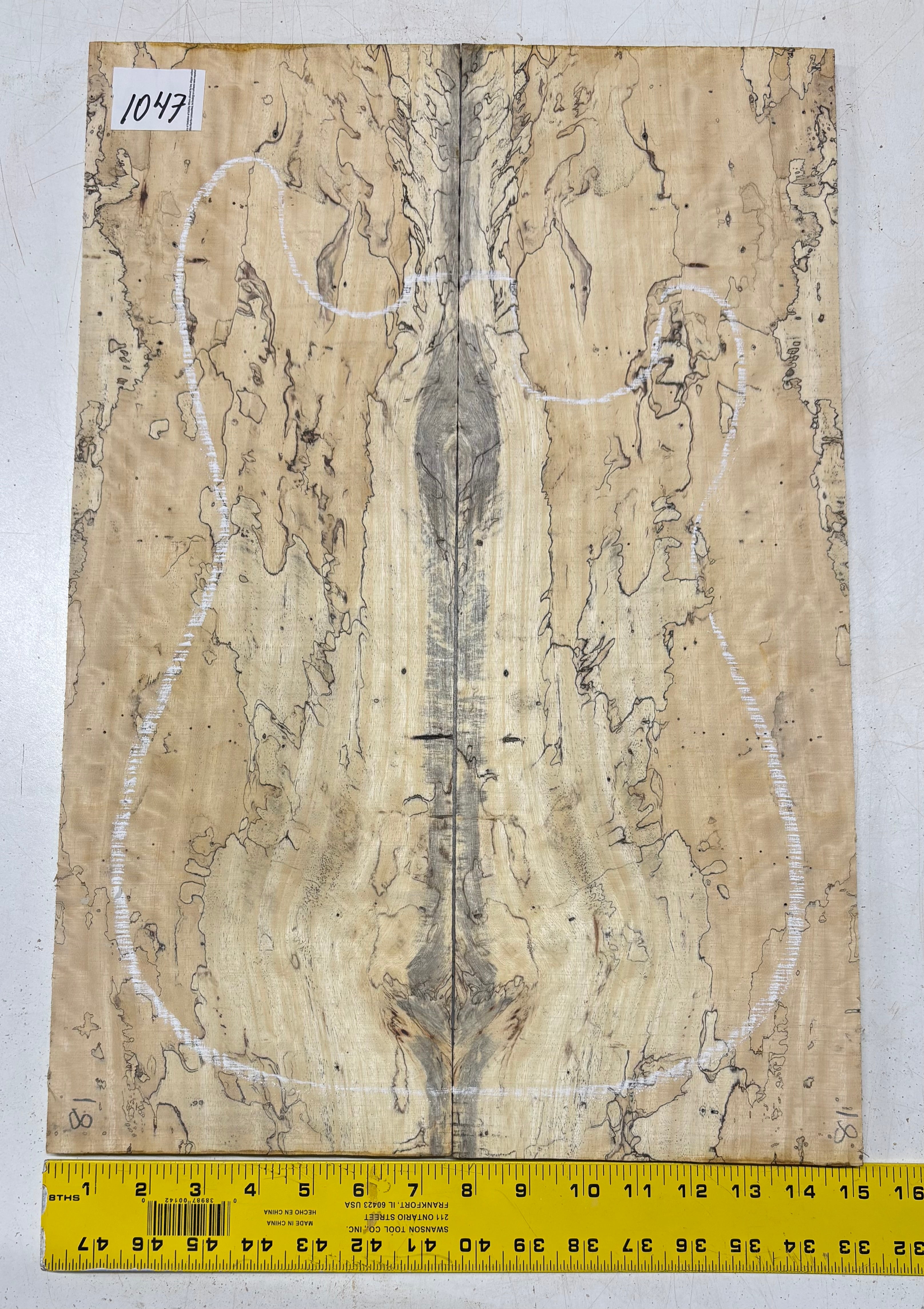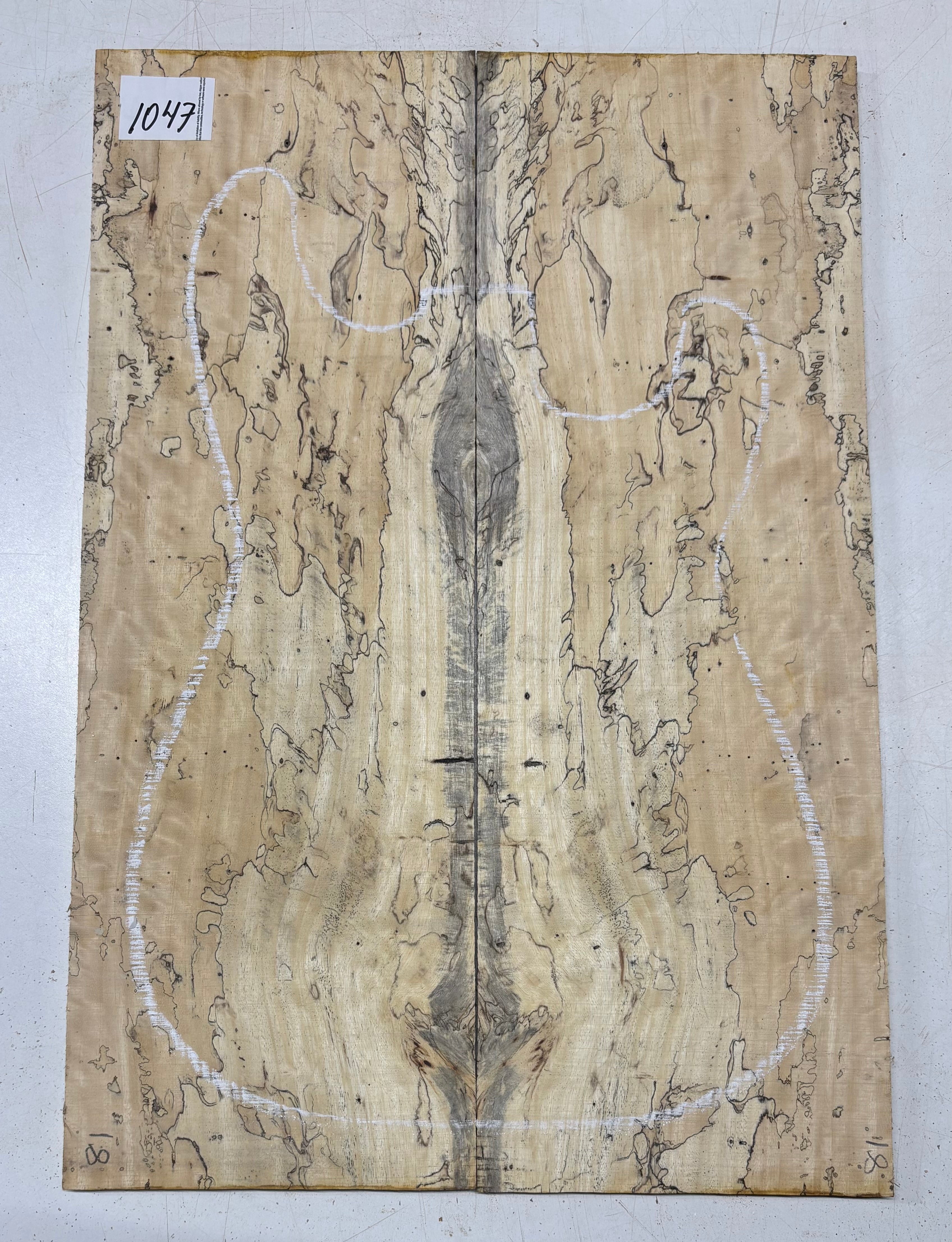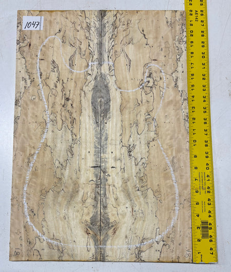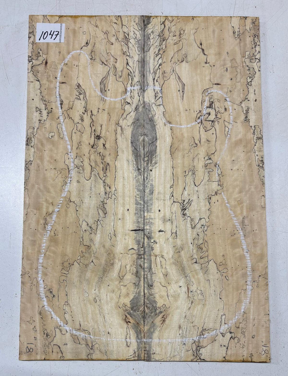 Turn heads with this stunning Spalted Tamarind Drop Top, a rare and exotic bookmatched set that showcases nature's artwork in bold, expressive grain. The creamy blonde base is streaked with dramatic gray and black spalting, creating a marbled, flame-like centerpiece down the middle—ideal for a statement electric or acoustic guitar top. This set offers a blend of visual impact and excellent workability.