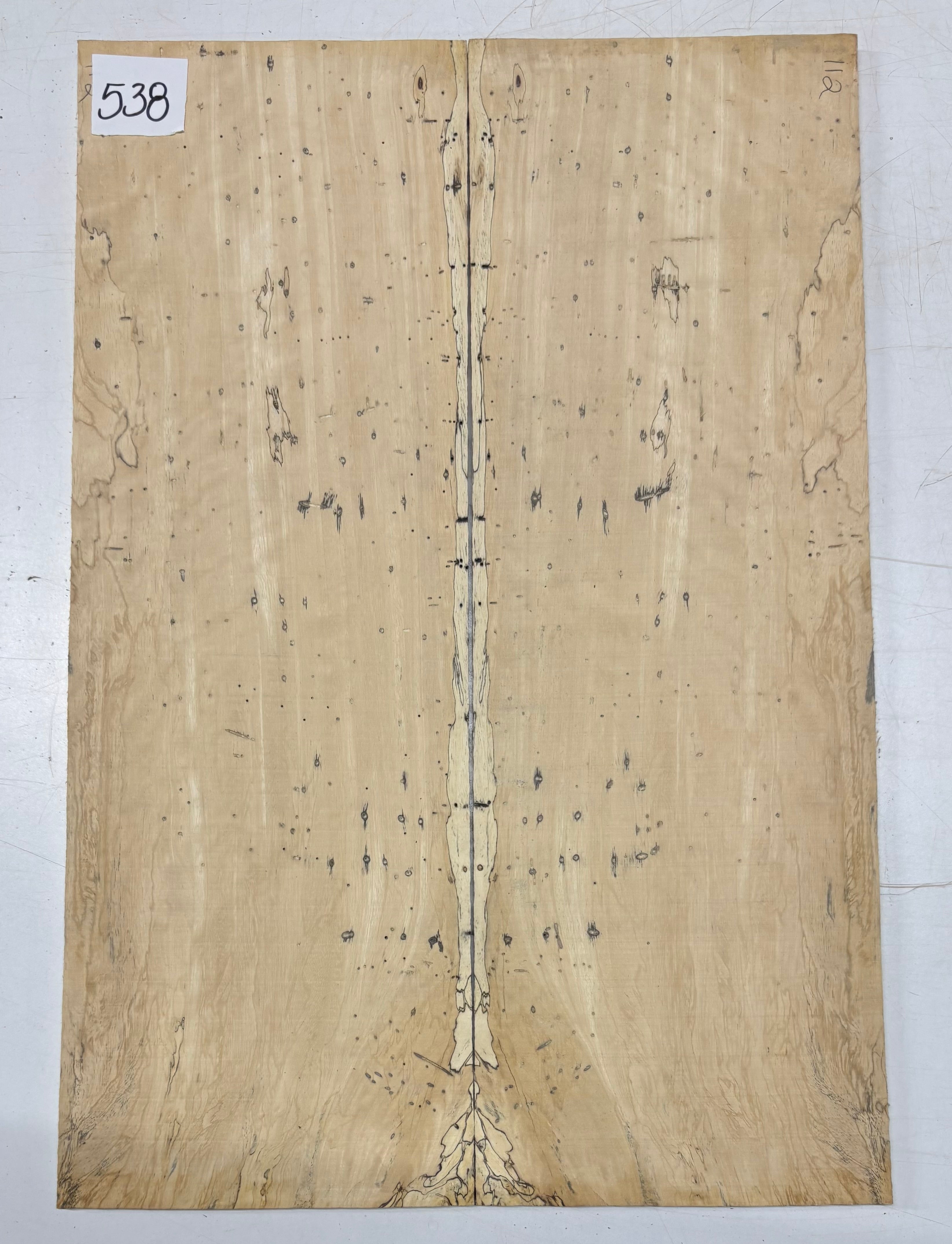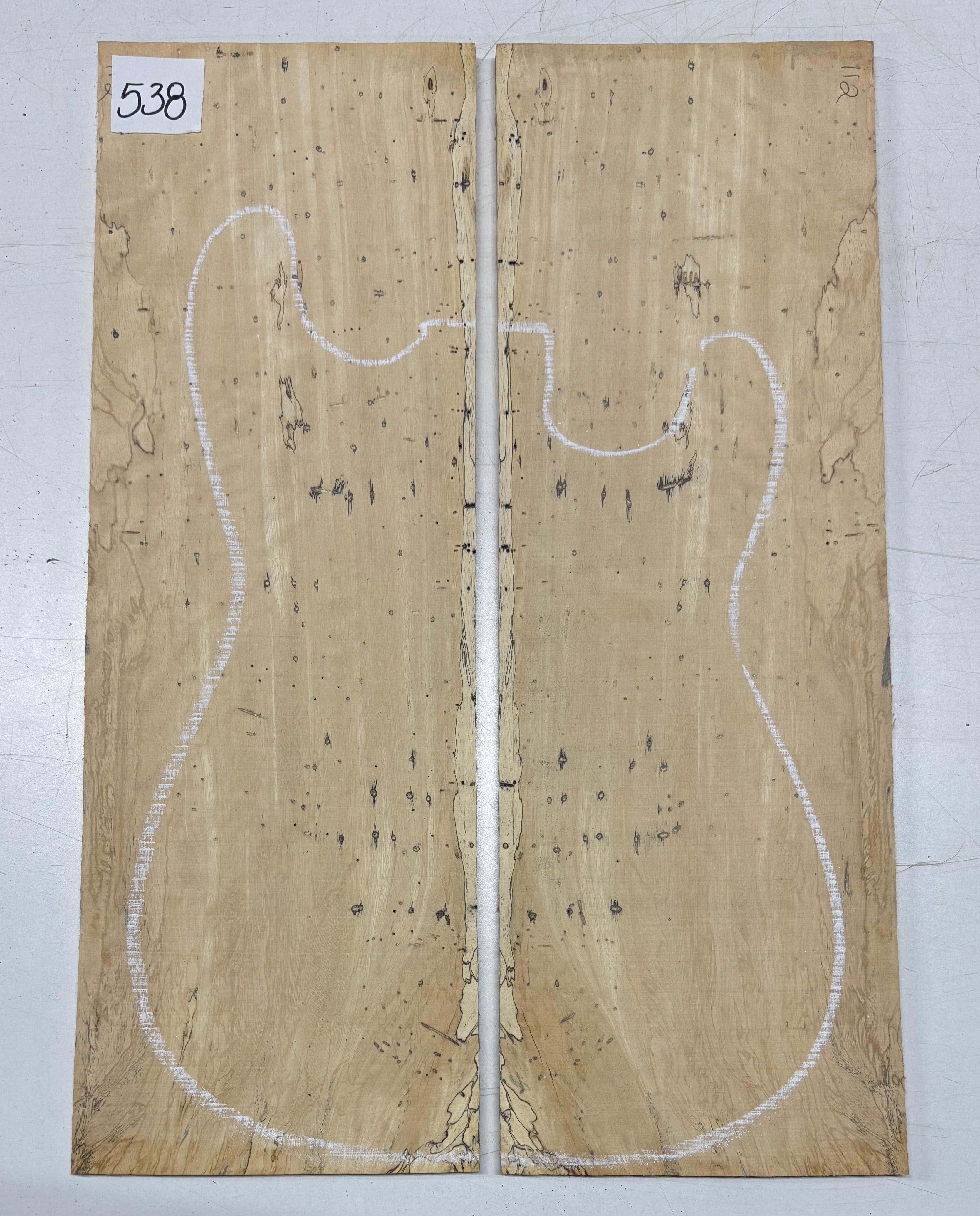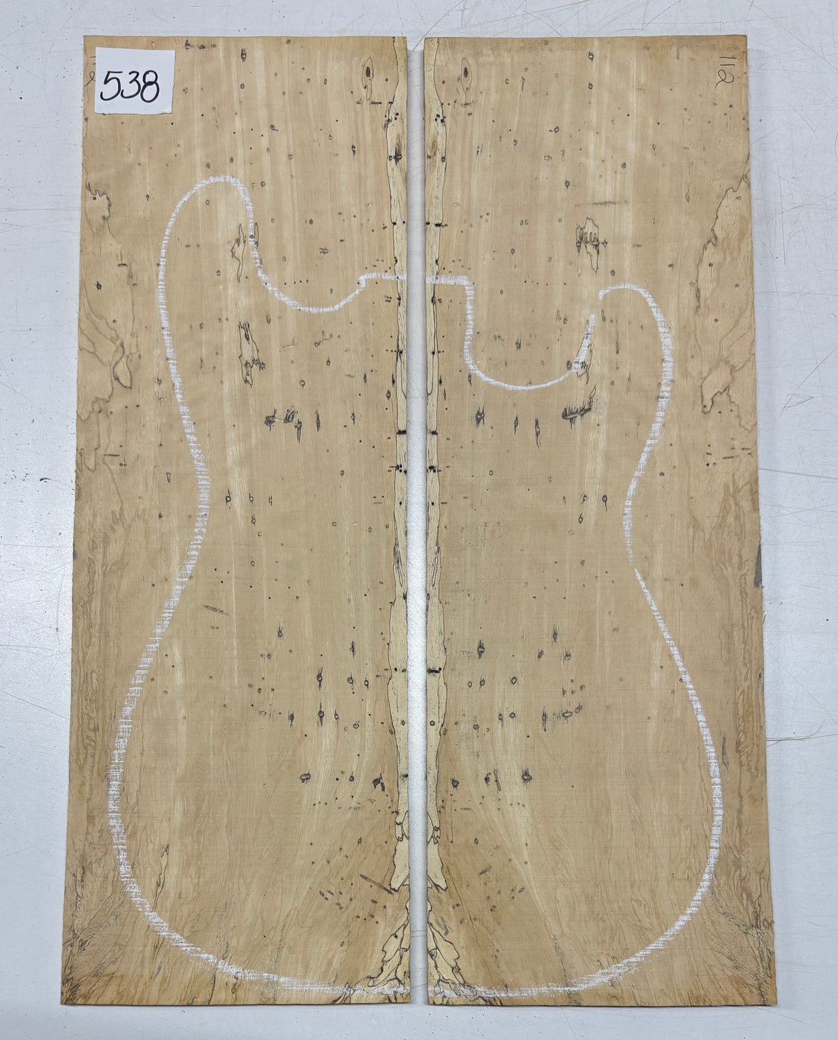 Turn heads with this stunning Spalted Tamarind Drop Top, a rare and exotic bookmatched set that showcases nature's artwork in bold, expressive grain. The creamy blonde base is streaked with dramatic gray and black spalting, creating a marbled, flame-like centerpiece down the middle—ideal for a statement electric or acoustic guitar top. This set offers a blend of visual impact and excellent workability.