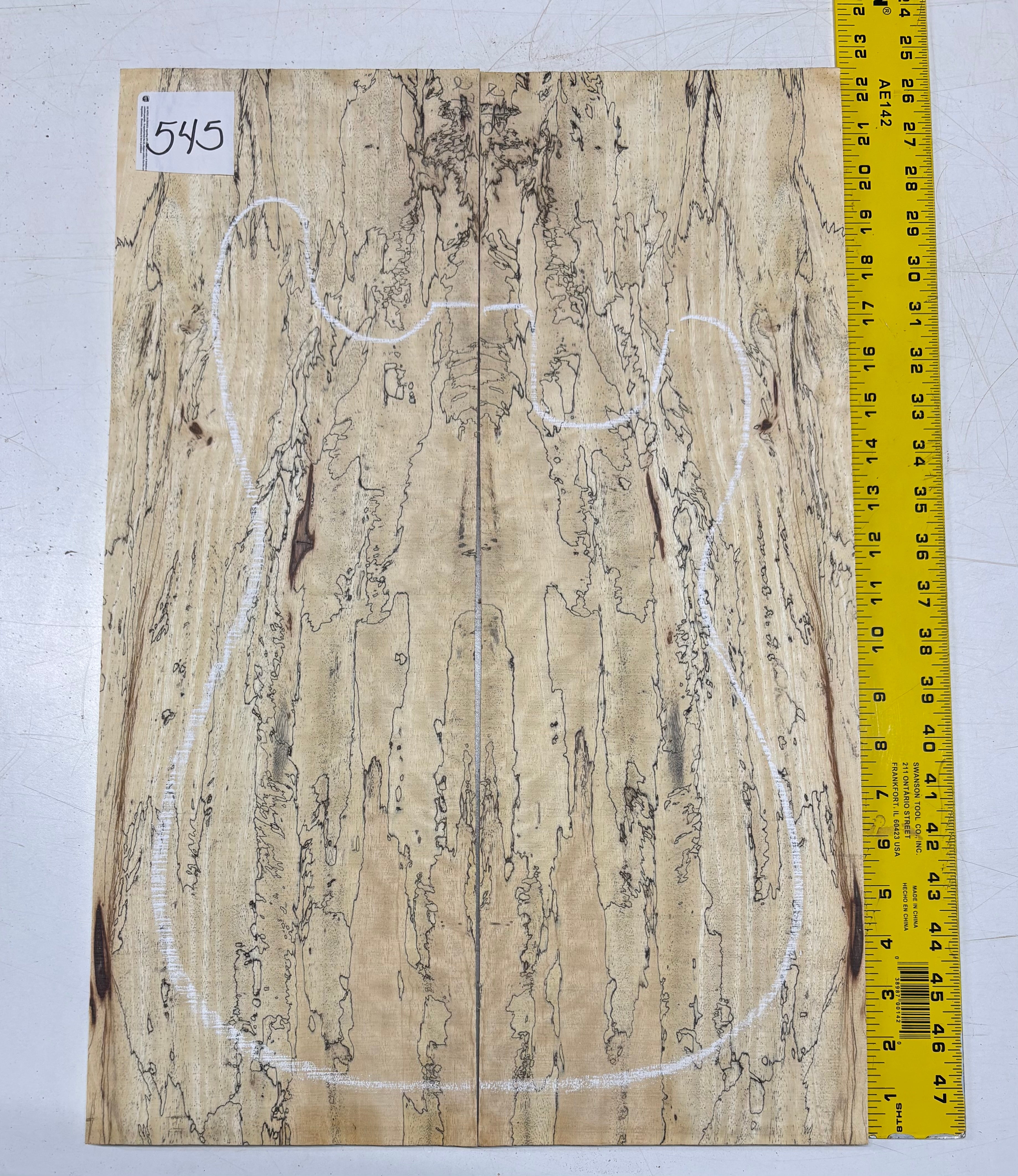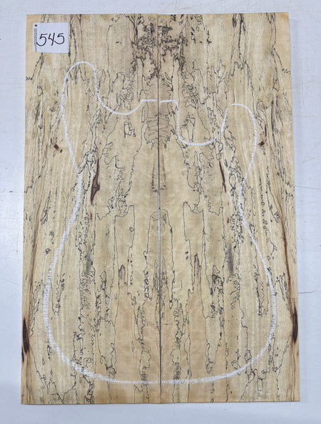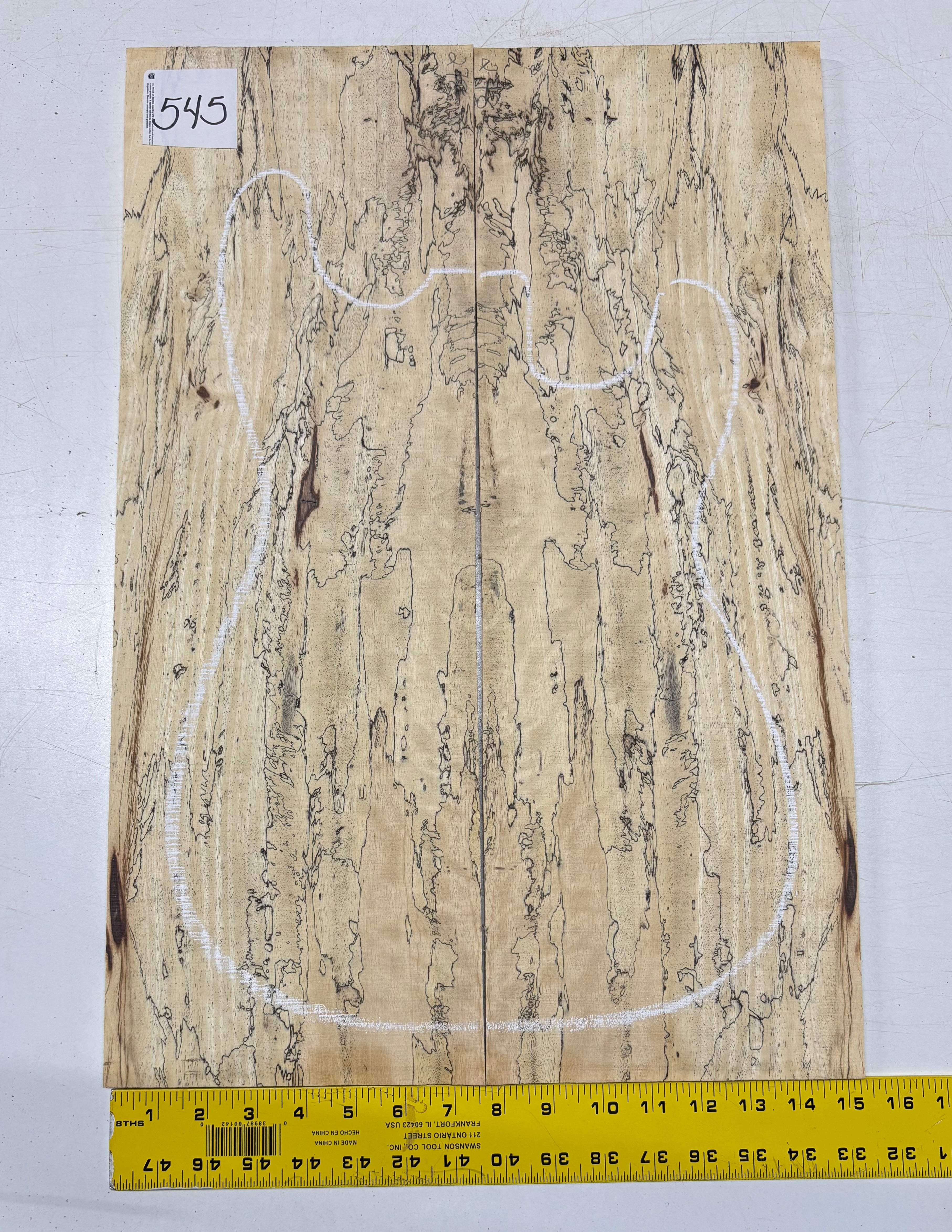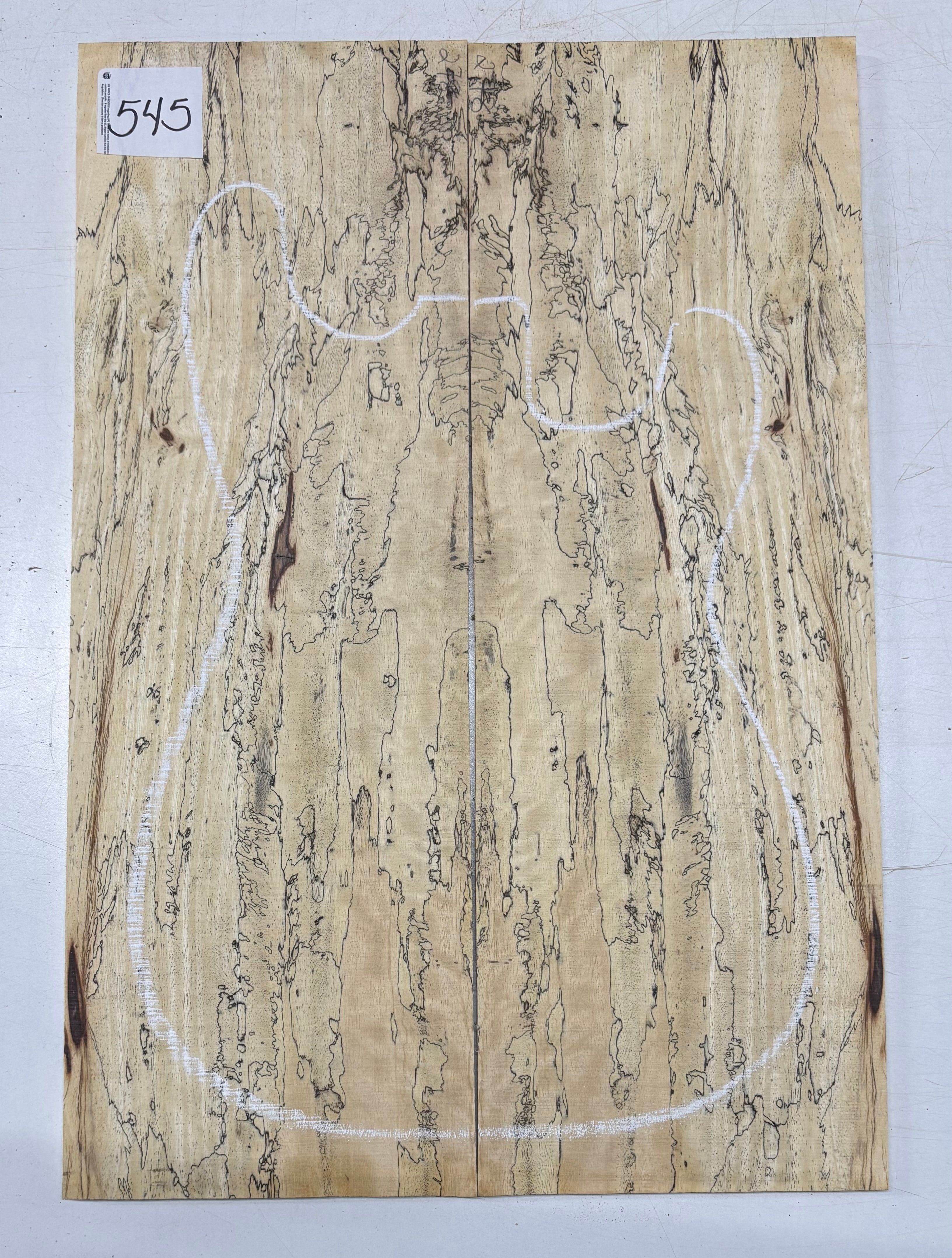 Turn heads with this stunning Spalted Tamarind Drop Top, a rare and exotic bookmatched set that showcases nature's artwork in bold, expressive grain. The creamy blonde base is streaked with dramatic gray and black spalting, creating a marbled, flame-like centerpiece down the middle—ideal for a statement electric or acoustic guitar top. This set offers a blend of visual impact and excellent workability.